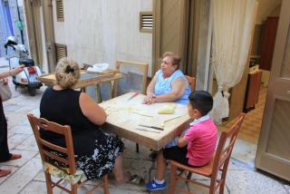 23. Пройдёмся теперь по улицам старого города. Лучше не отставать от гида, так как улочки застраивались таким образом, чтобы осаждавшие город завоеватели путались в этих лабиринтах. На улочках можно увидеть хозяек, готовящих домашние "ореккьетте" - вид местной пасты.На площадях увлечённо смотрят футбол местные тифози (болельщики). Их возраст от 2-3 лет до 90, причём каждый знает всех членов местных футбольных команд. Стул у телевизора можно забронировать на год за 10 евро.