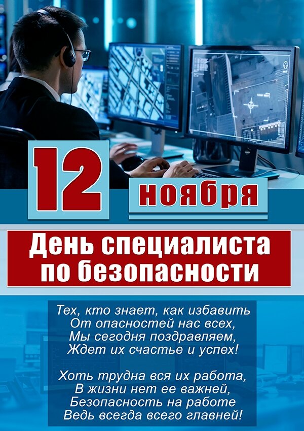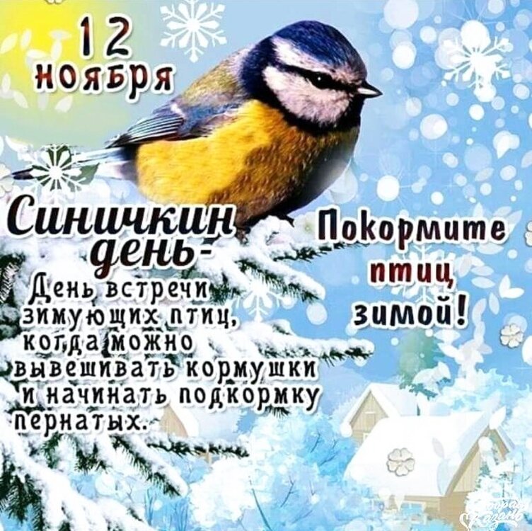 12 ноября. День специалиста по безопасности - праздник всех специалистов, связавших свою судьбу с этой нелёгкой профессией секьюрити (англ. security), главная задача которых - обеспечение максимальной безопасности объектов, людей и информации, передаваемой по системам связи. День работника Сбербанка России отмечается ежегодно 12 ноября, начиная с 1998-ого года, а дата для праздника выбрана не случайно. 11 ноября (30 октября) 1841-ого года император Николай I подписал Указ об учреждении в России сберегательных касс. Синичкин день - российский экологический праздник, который был создан по инициативе Союза охраны птиц России. В этот день жители разных населённых пунктов страны готовятся к встрече птиц, остающихся на зимовку в российских регионах - синиц, щеглов, снегирей, соек, чечёток, свиристелей. Люди заготавливают для них подкормку, в том числе и "синичкины лакомства" (несолёное сало, нежареные семечки тыквы, абуза и подсолнечника, сушёную рябину), делают и развешивают кормушки.