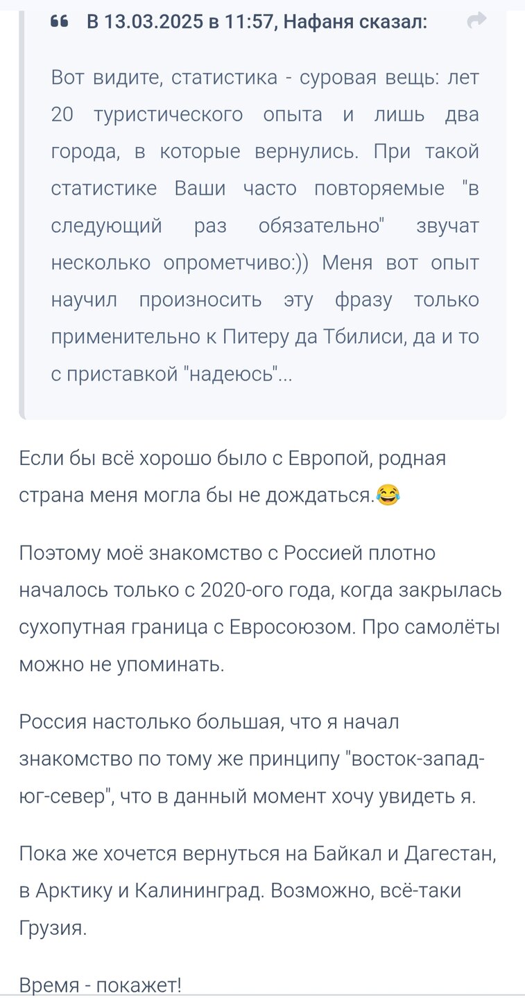 17. Приветствую всех на страницах моей новой темы!️ "Путешествовать - значит жить!" Вдохновляющая цитата Ханса Кристиана Андерсена давно стала несомненным девизом для многих людей, не представляющих свою жизнь без туристических поездок. Полностью согласен с этим.💁 Куда поехать этой зимой?!!🤔 Ещё в начале осени я сомневался, готов ли я покорить великий Байкал. В ноябре на работе уже по традиции "записался" на февраль, добавив ещё и март. В декабре я уже твёрдо решил, что поеду с ТТВ в тур по Бурятии и Байкалу, в любую из дат. Впервые Байкал появился у ТТВ летом в 2021-ом году. Я же в то время поехал "знакомиться" с Алтаем. Это был мой первый тур по России с ТТВ. Туры на Байкал с каждым годом только набирали популярность. Я читал новые отзывы туристов, запоминал информацию, готовился к туру. И вот спустя почти 5 лет свершилось - я еду смотреть Бурятию и зимний Байкал с любимым ТТВ.🤩
