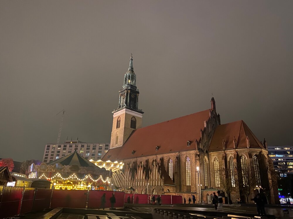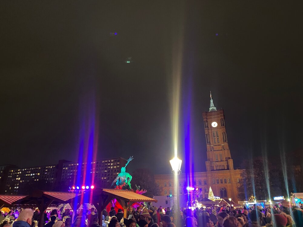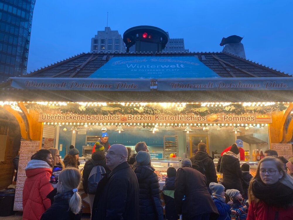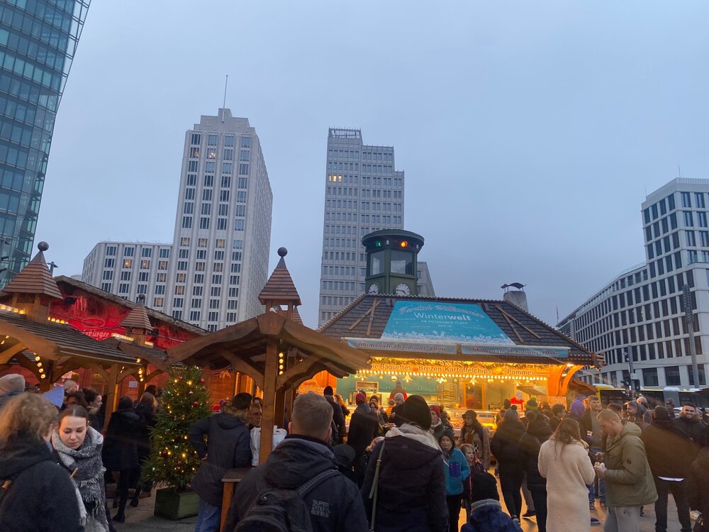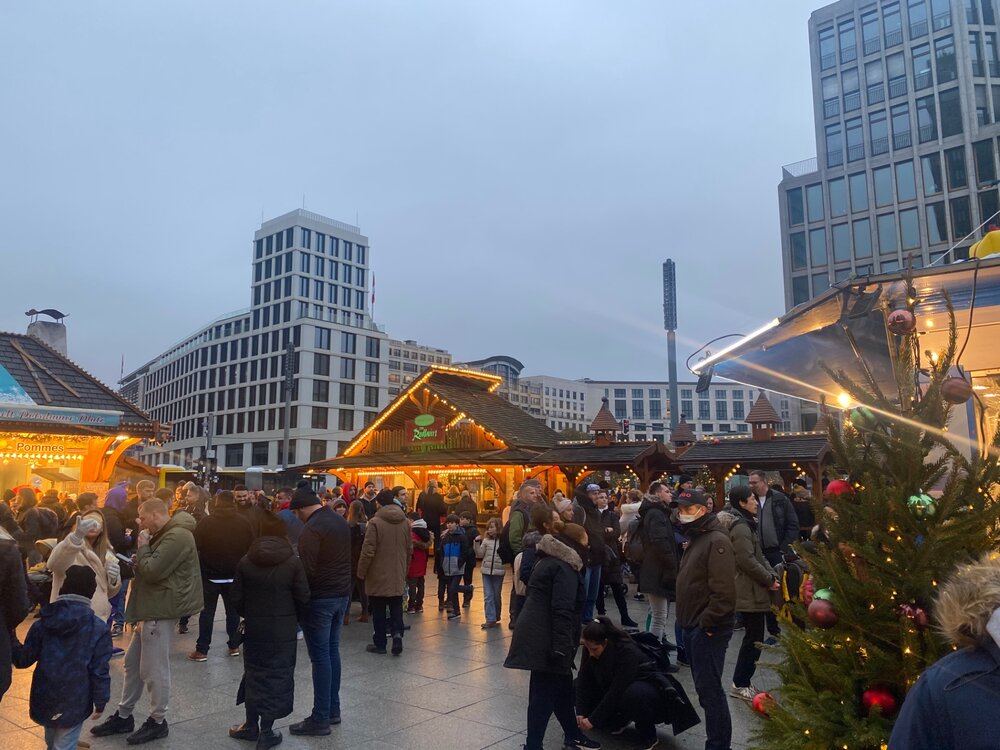 Разговариваю с приятельницей, наши мужья работают в одной фирме. Она говорит - а не поехать ли нам посмотреть что там у немцев? Сказано сделано. Покупаем билеты, бронируем отель на выходные. До Берлина ехать 4,5 часа. Цель нашей поездки - ярмарки. Поэтому у нас не будет никаких музеев и туристически познавательных мест. Только совсем чуть чуть. От остановки автобуса на электричке добираемся до Потсдамер платц. В общественном транспорте тут принято носить маски. Да не простые, а вот такие. Впрочем, не все соблюдают и я надела ее один раз. Ярмарка тут не большая и не такая красочная. Но мы отметились и даже приобрели наши первые кружки. Но зато тут есть горка, искусственная. Где ж взять в +8 настоящий снег то. А мы продолжаем путь, решили пойти пешком, попутно осматривая украшенный город.