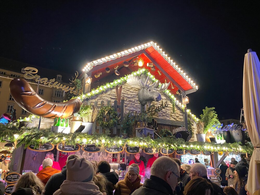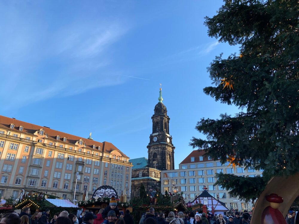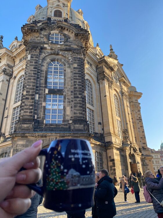 Ярмарки в Дрездене располагаются во всех свободных местах исторического центра. Доходим до первой. Вот и первая кружечка! Вполне симпатичная. Днем конечно ярмарка выглядит не так красочно. А вот еще кружечка 2019 года! Мы были в туре Магия Рождества в 2018 году с ТТВ и у меня такая кружечка была, только белая. Но она разбилась. Наш котик очень любит пить из кружек. Но голова его в кружку не помещается, он пытается ее наклонить и в итоге она падает. Поэтому у нас дома запрещено оставлять недопитую воду в кружках, иначе без посуды останемся. Как же хорошо что можно восполнить потерю через несколько лет. Ярмарка на Альктмаркт является главной и выглядит более красивой.