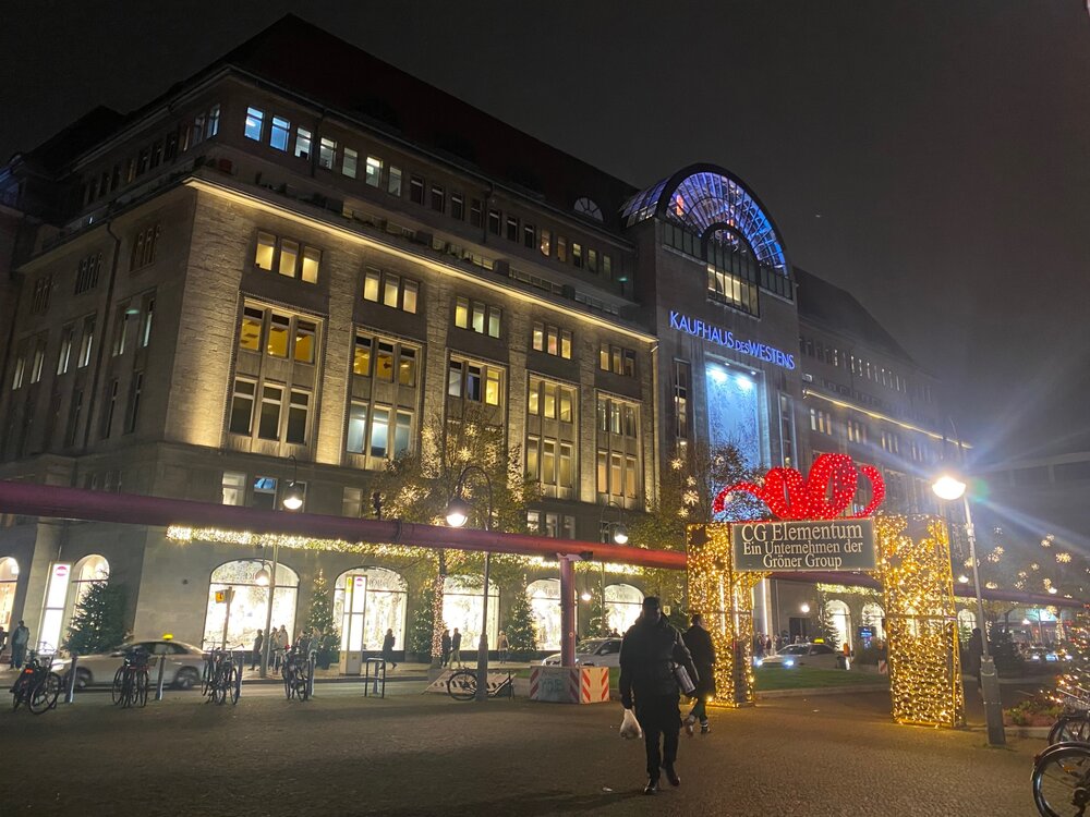 Потом мы садимся на автобус 100 и едем в сторону отеля. Отель у нас находится в районе ЗОО. Интересно было наблюдать по карте как едет автобус, он срезал 2 крюка и в итоге мы доехали быстрее😄 . Успели заскочить в универмаг KaDeWe. Красиво украшен. Очередь в магазин Луи Виттон