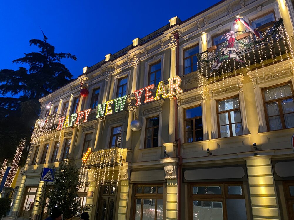 Не могу не продолжить свой отчет! Самым новогодним городом объявляется …. та-дам….Тбилиси! Весь город украшен просто невероятно, большие проспекты и небольшие улицы. Музыка, песни, люди танцуют. Глинтвейн, Баварские колбаски, шашлык, чешские трдельники, пряники, все что душа желает. Проспект Шота Руставели украшен на всем протяжении, каждое дерево, каждый куст. Главная ёлка. Ярмарка.