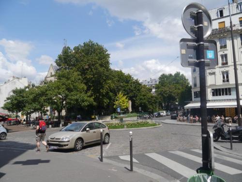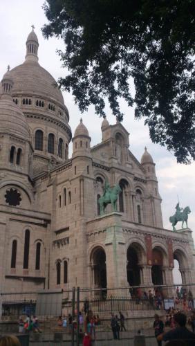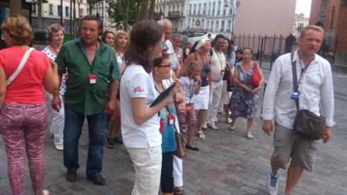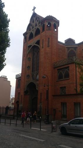 Название района Монмартр, последнего места, куда мы попали 27 июля 2014 года, воскресенье, происходит от: 1) латинского Mons Martis —Марсов холм по располагавшемуся здесь в античные времена храму в честь этого божества, или даже Mons Mercori в честь другого римского храма; 2) Mons Martyrium — Гора Мучеников /Холм Мученика - в честь святого мученика Дионисия Парижского, который будучи епископом, за распространение христианства в 272 году был здесь обезглавлен вместе с двумя другими проповедниками. Сегодня 130-метровый холм Монмартр на севере Парижа, давший название 18-му муниципальному округу Парижа, высочайшая точка Парижа, остаётся самым колоритным местом Парижа со своей энергетикой, атмосферой и неповторимой привлекательностью. Церкви и часовни, музеи и галереи, площади и скульптуры, театры и кабаре – всё это Монмартр. Живописные улочки, семейный магазинчики, кафешки, маленькие булочные…Здесь есть куда пойти и что посмотреть. Некоторые достопримечательности Монмартра: базилика Сакре-Кёр, площади Тертр, Пигаль, Далида (площадь певицы Далиды с памятником французской певице и актрисе итальянского происхождения, которая родилась и выросла в Каире, Египет), особняк Далиды, кабаре «У резвого кролика» ("Проворный кролик") и «Мулен Руж», музей Монмартра, виноградник Монмартра, скульптура «Проходящий сквозь стены», крупнейший в Европе «блошиный» рынок Сен-Оуен, мельницы Галетт и Раде, Стена Любви (надпись «Я люблю тебя» более чем на двухстах языках мира)... Итак, добираемся до Монмартра на нашем автобусе, у подножия холма высаживаемся близ какой-то станции метро, скорее всего, у станции метро «Бланш» (Blanche), где за 2 евро берём аудиогиды (кроме моей матери, как всегда) и движемся к месту встречи с гидом по Монтмартру – месье Вольдемаром – королём Монмартра)) Фотографии по Монмартру, увы, получились несколько размытыми, так как батарея смартфона почти разрядилась (зарядка к началу экскурсии составляла всего лишь 2%, а батарея фотокамеры села ещё раньше). Как видим, улица к месту встречи поднимается вверх, то есть мы поднимаемся по Монмартру... Место встречи - церковь Святого Иоанна /Сен-Жан-де-Монмартр (Église Saint-Jean de Montmartre), построенная в 1894-1904 годах. Это одна из первых церквей в Париже, построенная в стиле модерн. Архитектор Анатоль де Бодо постарался скрыть отлитую из железобетона конструкцию отделкой из красного кирпича. В строительстве храма впервые применялась новая технология использования армированного цемента. Отсюда прозвище здания – «Сен-Жан-де-Брик», т.е. Сен-Жан из кирпича. Цветочный орнамент в стиле ар-нуво причудливо сочетается здесь с перекрещенными арками, напоминающими архитектуру ислама. Достоянием церкви является орган из мастерской Кавайе-Коля... С рассказа об этой церкви и начал свою экскурсию парижанин месье Вольдемар. На фотографии – это блондин справа, примерно моего возраста, то есть лет 35 или чуть старше. Отличный рассказчик, помимо основной темы (рассказ о Монмартре и его знаменитых обитателях) дополнительно сообщал нам и другие интересные сведения о Париже. Кроме того, владея в совершенстве русским языком, без акцента, свободно общался со многими нашими бойцами по различным частным вопросам – однозначно «свой» парижанин для русских :i-m_so_h: Кстати, отзывы о нём я видел исключительно положительные. При этом называют его почему-то Владими