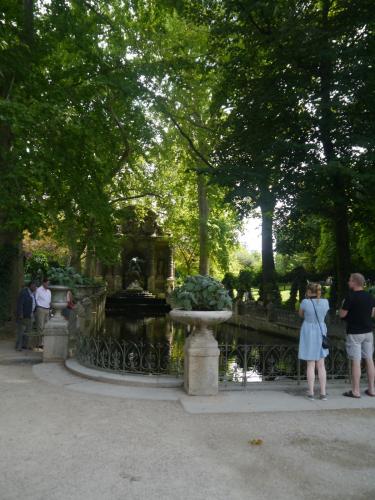 Продолжаем изучать сад, двигаясь теперь в юго-восточном направлении. Неподвижные бюсты известных деятелей прошлого и безыствестные живые бегуны настоящего. Начало второго часа дня понедельника... Итак, мы возвращаемся в центральную часть сада (парка), но с противоположной стороны. Перед нами - Люксембургский дворец. Построен в 1631 году, после 16 лет работ. С 1799 года дворец занимает верхняя палата Франции - Сенат (вокруг дворца расставлены жандармы). В определённое время по предварительной записи (бронированию) во дворец можно и попасть... На таких полянках между стенами из деревьев народ расслабляется, лёжа на травке... Конечно, обычно так позируют заезжие голливудские звёзды! :biggrin: А тут и наши звёзды появились, случайно так (немного на заднем плане) - первая в чёрном - мадемуазель Надежда Жабина - та самая, на которую запал негр-охранник из Сакре-Кёр, вторая в розовом - её лучшая подруга, мадемуазель Инна Какошкина - та самая, которая вчера же украсила собой памятник Жана Маре - "Человека застрявшего в стене", посвященного писателю Марселю Эме... Пустынный уголок под палящим солнцем... А сей уголок собрал музыкантов, довольно долго рассаживающихся по местам и готовящихся сыграть нечто стоящее :smile: Решили не дожидаться. Дошли до ближайшего входа, где приобрели мороженое в виде разнобразных шариков (киви, шоколад и т.п.), оно нам понравилось, кстати; потом дошли до Сената... Здесь у меня была небольшая фотоссесия. За моей спиной - Пантеон, и скоро мы там окажемся, правда, пока ещё сами об этом не знаем... И в заключении прогулки по саду мы оказываемся около фонтана Марии Медичи - наиболее посещаемом туриставми месте Люксембургского сада. Датируемый XVII веком фонтан Медичи был построен с восточной стороны Люксембургского дворца по указанию Марии Медичи. Фонтан был выполнен в стиле барокко, характерном для того времени. Предполагается, что фонтан Медичи был возведен Саломоном де Броссом. Мифичекие скульптуры были сделаны Огюстом Оттеном в 1866 г. Эти скульптуры относятся к мифу о Полифеме, который застал Галатею с пастухом Ациссом. На фонтане изображен эпизод, когда Кентавр, сделанный из бронзы, готов наброситься на Галатею, сделанную из белого мрамора, которая, ничего не подозревая, все еще находится в объятиях Ациса. С другой стороны фонтана можно увидеть прекрасный барельеф де Валуа (1806 г.) , на котором изображена Леда с лебедем. Этот фонтан-грот привлекает своей красотой, контрастом и незаурядной композицией. Всё, достаточно на первый раз, идём дальше! :derisive:
