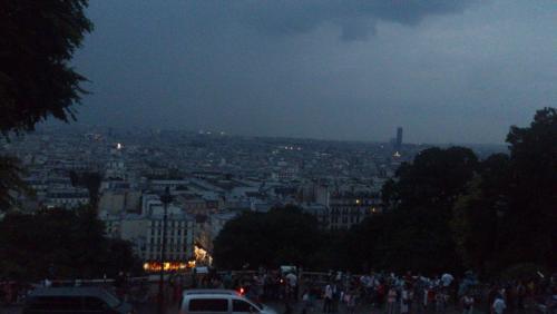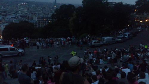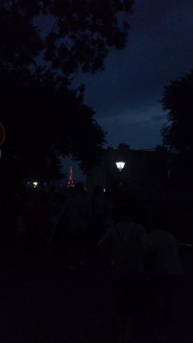С площади у храма открывается великолепная панорама Парижа, но можно и подняться еще выше! На куполе базилики расположена смотровая площадка, куда ведет винтовая лестница. Оттуда как на ладони виден не только сам Париж, но и его окрестности на несколько десятков километров вокруг. Смотровая площадка с купола, естественно, платная. О ней вопрос у нас как-то даже и не вставал. Опять какой-то уличный концерт в столице "лягушатников". Видимо, по выходным так принято... Довольно-таки зрелищная панорама... Наше следующее мероприятие здесь же – созерцание мерцающей Эйфелевой башни. Мерцающее освещение включается на 5 минут каждого часа с 22.00 до 3.00 (или с 20.00 в зимнее время). Минут 20 после храма томимся в ожидании этого шоу. При чём конкретное место, с которого нам предстоит созерцать, находится ближе к дороге, в тени деревьев, где мы находились до экскурсии в храм. Месье Вольдемар говорил, что это самое лучшее место для созерцания мерцающей Эйфелевой башни. Ну а поскольку мы на этом месте были чуть ли не единственными (или почти) со всего Парижа, то заодно ещё – и самыми умными :biggrin: Полагаю, здесь ещё и вопрос личной безопасности, связанной с кражей вещей, Не случайно, как вышли из храма, нас сразу предупредили о том, чтобы внимательнее были. Да и до экскурсии в храм по той же причине, видимо, причине, ожидали за оградой. К тому же, говорят, ходят негры и крайне настойчиво предлагают заплести нитку на запястье, и после требуют за нее деньги. Нитку снять без помощи ножа или ножниц невозможно. А пока один заплетает, другой лезет в ваш карман или сумку. В общем, как-то опасно здесь, если ходЮТЬ тут всякие :biggrin: Ну а месье Вольдемар что-то тоже интересное рассказывал. Например, советовал прокатиться по 1 или 14 линиям парижского метро – самым современным, так как по ним ходят составы без машинистов. Кстати, лично мы с матерью воспользовались данным советом и на следующий день прокатились. Место расположения для созерцания мерцающей Эйфелевой башни, выбранное месье Вольдемаром, я оценил ещё тогда же. Сперва я пытался расположиться поближе, даже залезал повыше. Но когда башня начала мерцать, понял, что лично моё место не совсем удачное. А когда я вернулся к месту расположения месье Вольдемара с нашими, то понял, здесь действительно лучше. А учитывая безлюдность места, то и безопасно также. Ну вот один из последних кадров, сделакнных на мой "умирающий" без зарядки смартфон. На этом месте он у меня и отключился...