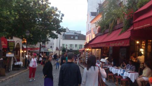По пути до базилики Сакре-Кёр (от ресторана «Мулен де ла Галетт» - это поход другим путём в обратном направлении, теперь – на юг) перед нами предстаёт площадь Тертр (Place du Tertre, площадь Холма (кургана)) — «сердце Монмартра». Площадь квадратная, со всех сторон окруженная плотным рядом строений: основная застройка площади относится к 18 веку. Является одной из самых посещаемых достопримечательностей Парижа. И это наглядно было видно и в наш вечер на Монмартре: всюду снующие толпы народа, и большей частью - туристы. Здесь много ресторанов со сверхвысокими ценами, а также художников, которые тут же в присутствии покупателей по памяти переносят пылающие краски парижских достопримечательностей на свои скороспелые полотна. Для работы здесь требуется концессия Союза художников, которую очень трудно получить. В районе площади Тертр… Одним из наиболее примечательных мест площади Тертр является заведение La Mère Catherine «У матушки Катрин» (6 Place du Tertre), о котором нам рассказывал месье Вольдемар. Этот ресторанчик открыла в 1793 году Катрин Лемуан, отсюда – и соответствующее название. Благодаря русским казакам, взявшим в 1814 году высоты Монмартра, заведение стало первым «бистро» во Франции и примером для других заведений подобного рода. Голодные вояки не желали ждать, пока приготовится какое-то изысканное блюдо и орали: «Быстро! Быстро!». Поскольку во французском языке нет звука «ы», то произношение этого слова закрепилось как «бистро» (на заведении расположена соответствующая мемориальная табличка). Так стали называть заведения, где пища готовится по стандартным рецептам и подаётся очень быстро.