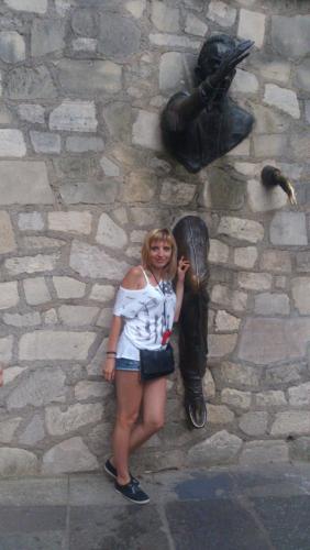 Далее мы проследовали до маленькой площади Марселя Эме (Place Marcel-Ayme), на которой есть странный памятник-барельеф. Вот он! Из каменной стены навстречу публике выходит человек (Le passe-muraille). Лицо, колено, руки, устремлённые вперёд…У этого бронзового изваяния есть реальный прототип – писатель Марсель Эме (1902 – 1967 гг.), творивший в жанре мистики и абсурда, волшебной сказки, ирреального юмора, гротеска и трагедии. По мотивам произведения Эме «Человек, проходящий сквозь стены», создана загадочная скульптура. Рассказ о простом бухгалтере Дютийеле, наделённом необычной способностью – проникать через стены, полюбился читателям. Фантазия писателя придумывает для «супергероя» неожиданные сюжетные повороты. Пользуясь своим даром, влюблённый самонадеянный Дютийель проникает в дом к замужней женщине, которую ревнивый муж запирает на замок. Неожиданно действие магии кончается, герой навсегда замирает, зажатый между камней, стиснутый стеной. Популярный рассказ послужил сюжетом для киноленты, снятой в 1959 году Ладислао Вайда. А друг писателя, всем известный «Фантомас» – актёр Жан Марэ, который увлекался скульптурой и живописью, создал в 1989 году это оригинальное изваяние высотой в 2,5 метра. Месье гид Вольдемар ещё от ресторана «Мулен де ла Галетт» на эту тему рассказывал, центральное место в его рассказе занимал сюжет произведения Эме. Кстати, когда мы были в этом месте, поблизости от этого оригинального изваяния спал какой-то бомж. Кто-то из наших стал его фотографировать, как достопримечательность видимо. "Во Франции запрещёно фотографировать человека без его согласия," - поучительно изрёк месье Вольдемар. Однако те, кому нужен был бомж на память – те его с превеликими удовольствием засняли :smile: Разумеется, как и скульптуру, рядом с которой выстроилась большая очередь из желающих попозировать на фоне достопримечательности. Наш курс – базилика Сакре-Кёр…