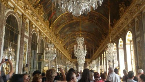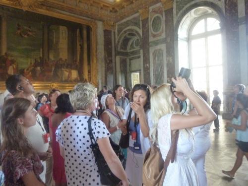 Дворец состоит из череды роскошно оформленных залов, наполненных изысканной мебелью, драгоценностями, произведениями искусства.... А также толпами туристов из разных стран в часы открытия :biggrin: Наша мадам гид Наталья, пичкающая нас знаниями о дворце и его обитателях :i-m_so_h: Дворцовая церковь (Часовня) Версаля является одним из самых восхитительных помещений дворца. Этот вид открывается из Королевской галереи, где король и члены королевской фамилии слушали мессы... Спальня с кроватью Короля-Солнца (Людовика XIV). Королевские спальни представляют собой проходные комнаты с кроватью в центре. При этом кровати удивительно маленькие... Богато расписанные потолки, всевозможные статуи, бюсты и портреты обитателей дворца, причудливые кружева мебельной отделки и т.п... Версальский парк из окон дворца... Зеркальная галерея - самый известный интерьер дворца. Размеры зала в плане 73,0 м × 10,5 м. Высота — 12,3 м. Семнадцати арочным окнам, выполненным во всю высоту продольной стены, вторят расположенные на противоположной стене зеркала в бронзовых оправах, аналогичные по форме и размерам. В зеркалах отражаются дали Версальского парка. Кроме того, усиленный обилием зеркал, позолоты и хрусталя солнечный свет насыщает галерею каким-то особенным, только ей присущим сиянием и прозрачностью. Восхитительное место! :i-m_so_h: Зеркальная галерея стала образцом для многих залов европейских дворцов. :i-m_so_h: После посещения дворца нас ждет прогулка по садово-парковой части дворцового комплекса, посещение которого оплачивается отдельно.