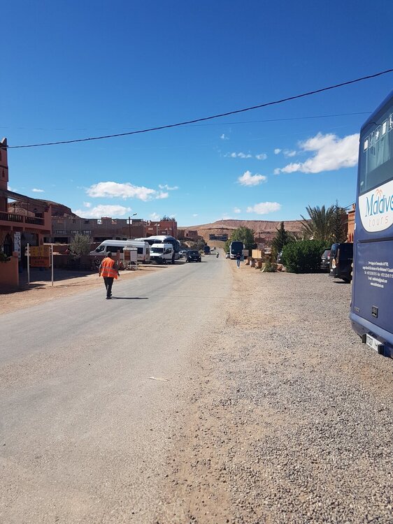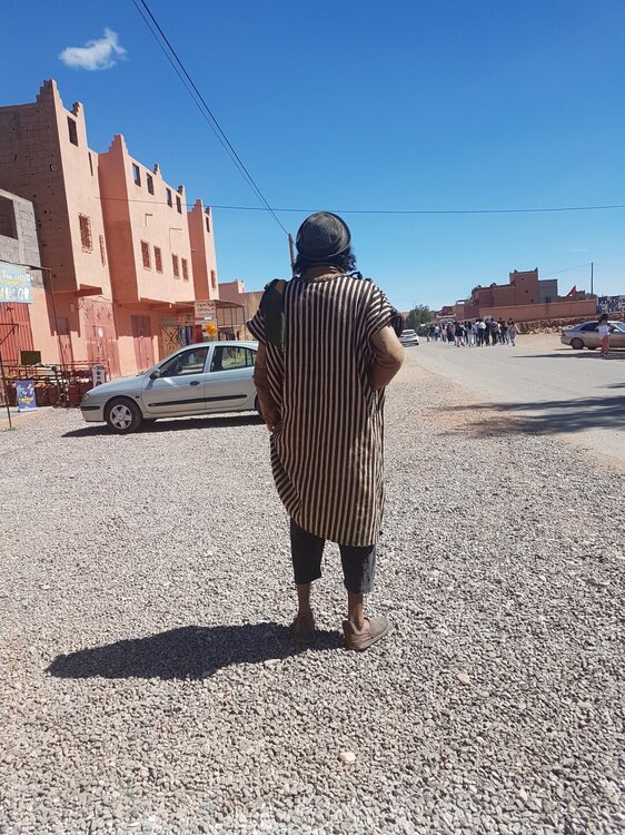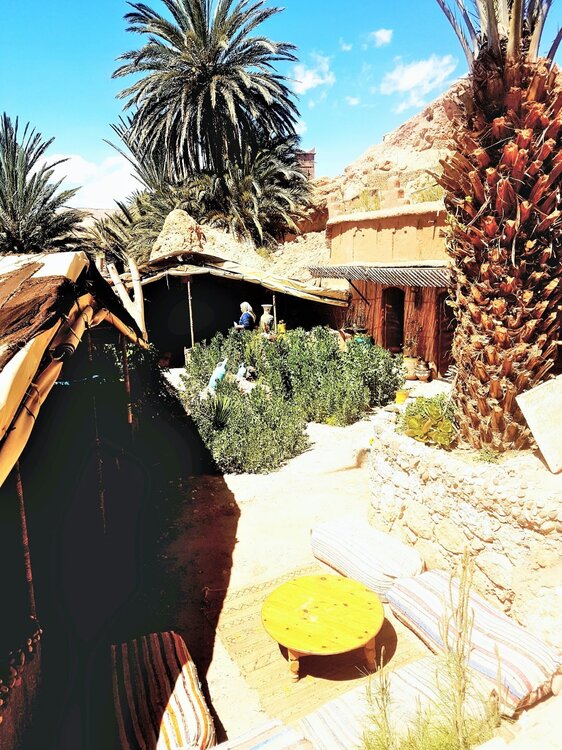 Буквально, через 5 минут спешиваемся и внимание привлекает вот такая "колоритная личность"... В этом ресторане, с видом на ксар Айт-Бен-Хадду, и должен состояться обед... Кстати, чень приличное заведение. Для трапезы, на эту террасу и приглашают группу... А вот и вид на ксар... Я, как всегда, не обедаю, поэтому пошла прогуляться... Напротив ресторана отели... Ничего интересного не увидела и вернулась. Мы спокойно могли отдохнуть в одном из залов, заказать чай и, посредством "Wi-Fi", пообщаться с родными... А вот с этими мужчина мы пели "Подмосковные вечера" и "Катюшу"!!! Не помню, оба они учились в СССР или нет, но по русски говорили достаточно прилично... После обеда выезжаем из Айи-Бен-Хадду... Ой, не знаю, но глядя на эти дома, становится грустно... Справа - мечеть... Пожалуй, Айт-Бен-Хадду и есть истинная берберская деревня, а не та, в которую мы ездили... Выехали на "простор"... Горы Антиатласа... А едем мы в Уарзазат...