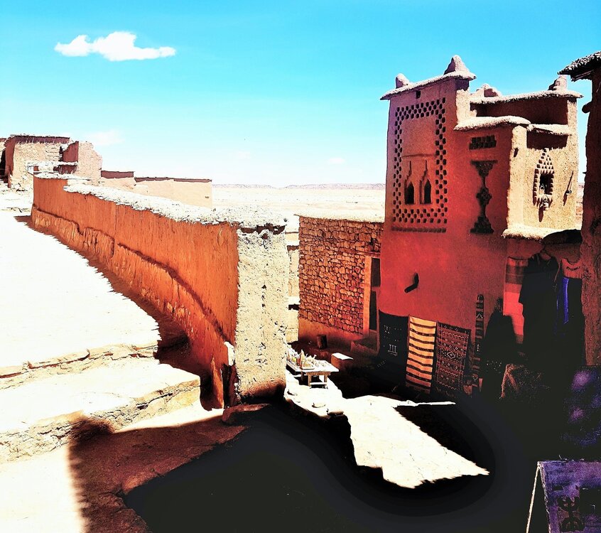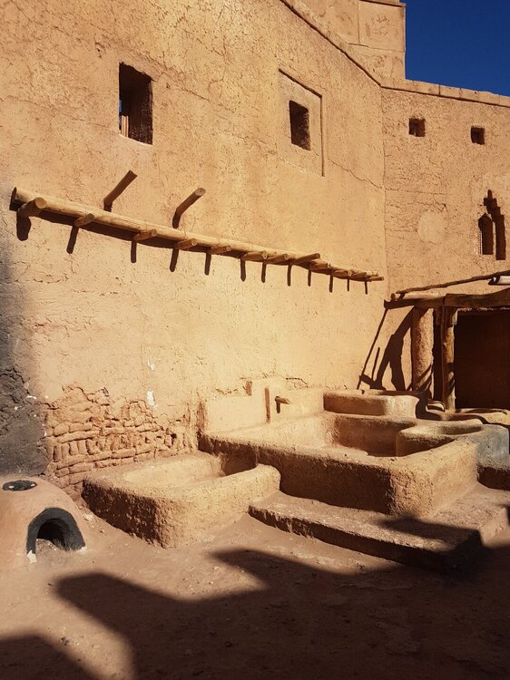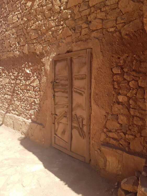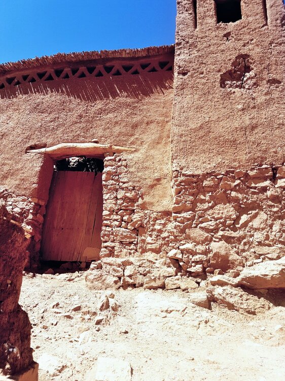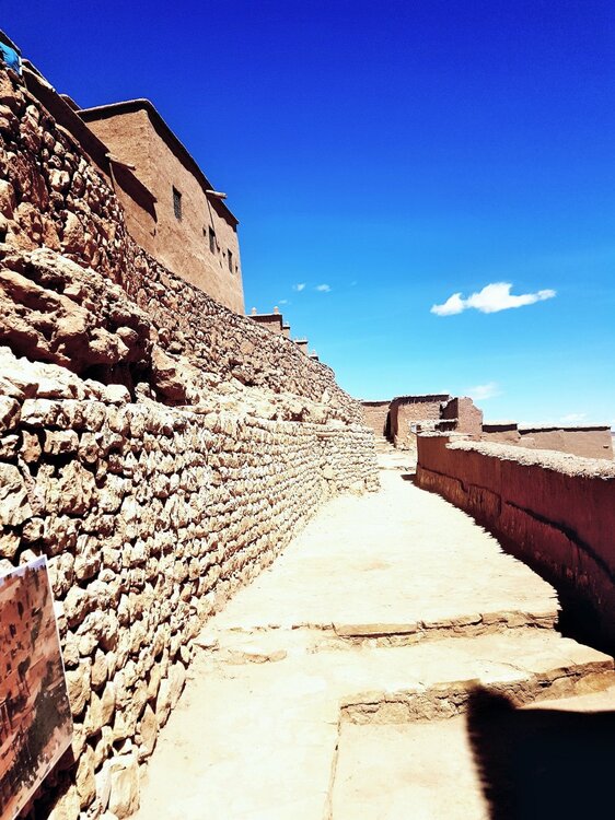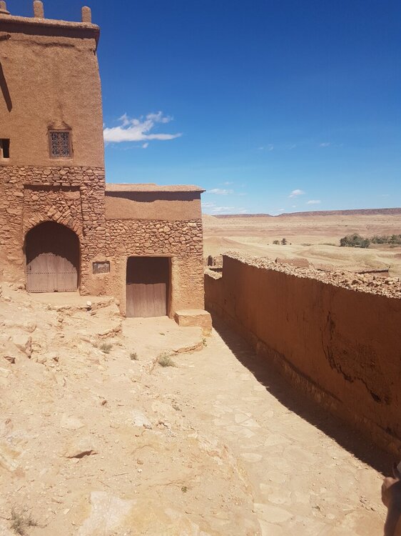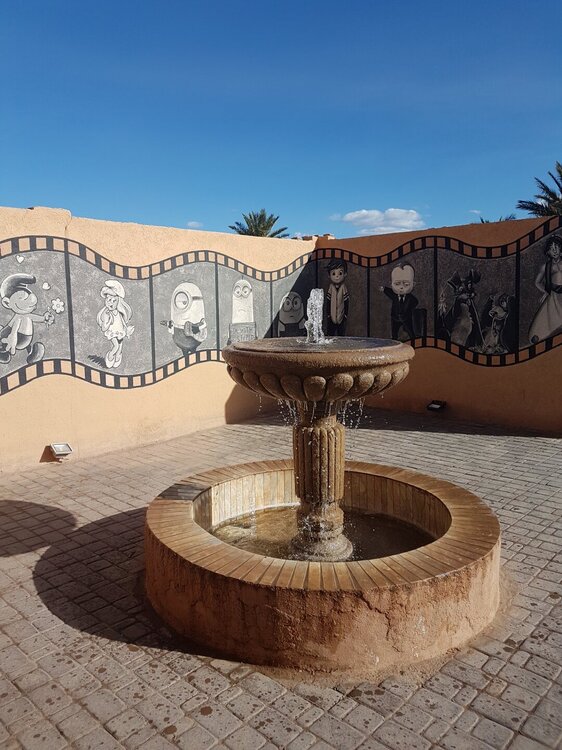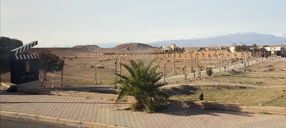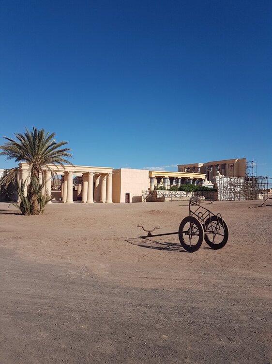 Ан нет, не доезжая 5 км. до Уарзазата, заезжаем на киностудию "Атлас". По площади - одна из крупнейших киностудий в мире. Большая часть недвижимости находится в близлежащей пустыне и горах. Многие декорации со съемок различных фильмов остаются на месте, поэтому студия проводит экскурсии с гидом и стала популярным туристическим направлением. Вот как мы подъезжали - не пойму, но именно в такой последовательности я фотографировала "пейзажи" за бортом... На территории киностудии находится и отель... Компания была основана в 1983 году предпринимателем Мохаммедом Белгми. Здесь снимали кучу легендарных фильмов - от Индианы Джонса и Лоуренса Аравийского, до Гладиатора и Игр Престолов. Выходим на площадь, на которой собраны реквизиты к фильмам, в основном - "транспортные" средства.... "Колесница" из "Гладиатора"... Винтовой реактивный самолет F-16, оставшийся со съемок романтической комедии Майкла Дугласа "Жемчужина Нила" (1985). Гоночный автомобиль... Лодка... Клетки для рабов... Павильон, где Мартин Скорсезе в 1997 году снял фильм "Кундун", про маленького мальчика - XIV Далай-ламу. В него мы "заглянем" позже... "Египетский дворец", в котором снимали сериал "Тут"... Киношная "древнеегипетская храмовая живопись"... Посидела на троне... Марокканцы способны в короткий срок построить любые декорации: от древних храмов, в натуральную величину, до небольших поселений с улицами, площадями и домами... Декорации к фильму "Гладиатор". На этих узких улочках снимали "Принц Персии: Пески времени"... Выходим...