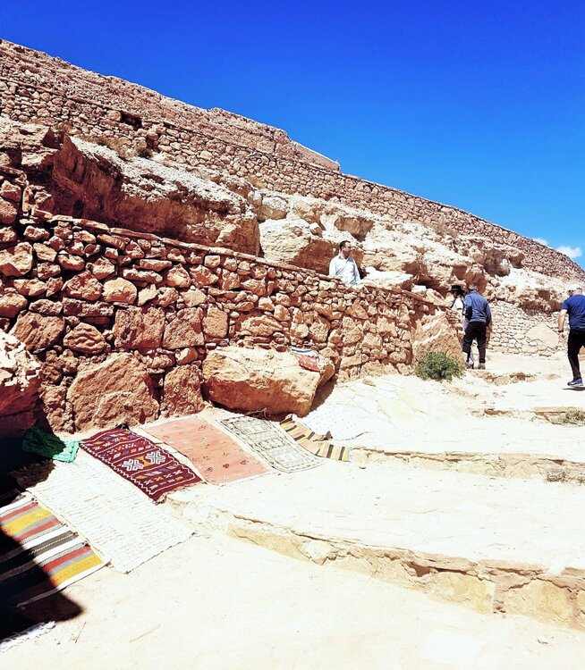Проезжаем мимо, по моему, отеля ... Въезжаем в Айт-Бен-Хадду, который, в принципе, ничем не отличается от всех предыдущих берберских поселков... Спешиваемся и сразу попадаем на своеобразный рынок... Идем к холму... И вдруг, арык... Цвет воды, конечно, шокирует, но это связано с преобладанием красной глины в почве ... Практически каждый дом - "торговая точка"... Айт-Бен-Хадду расположен на склоне холма на левом берегу реки Уарзазат (Варзазат). Река начинается на южных склонах Высокого Атласа и в дальнейшем теряется в песках Сахары. Раньше, чтобы попасть в Айт-Бен-Хадду нужно было пересечь русло реки на мулах за 5 долларов. Сейчас построили пешеходный мост, которому местные «предприниматели», конечно, не рады. Высыхающее русло... А это я...))) на фоне Ксар Айт-Бен-Хадду, который является одним из наиболее типичных примеров традиционной марокканской глинобитной архитектуры, распространённой в предсахарской области, южнее Высокого Атласа.