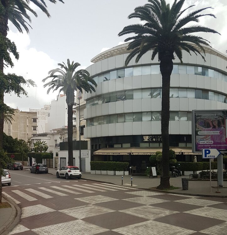 В Средние века Касабланка была зажиточным городом, известным как Анфа[en]. Он был разрушен португальцами в 1468 году и ими же заново построен в 1515 году. После сильного землетрясения 1755 года город снова был восстановлен. В 1907 году Касабланку оккупировали французы. Во время французского правления город быстро рос. Современный город был построен вокруг старого маврского города. Касабланка - самый европейский город страны, где из достопримечательностей только старая Медина (старый город) и очень красивая мечеть Хасана II на берегу моря. Едем по набережной Корниш... Ох, как же мне нравятся современные дома в Марокко!!! Ну, что тут можно сказать, кроме слов восторга! А тарелочки-то, как "воздушные шарики"... И два, четко видимых окна, с торца. А остальные закрашены... Мечеть Хассана II. О ней чуть позже... Здесь "спешиваемся"... Я умудрилась в автобусе переодеться, т.к. у меня "пунктик" - в столицах "прогуливаться" в платье...))) Обувь менять не стала. По программе: "...внешний осмотр мечети Хассана II...". Однако, Алексей предложил посетить и саму мечеть. Цену не помню, но что-то в пределах 15 евро. Кажется, еще предусматривалось посещение музея. Жалею, что отдала предпочтение прогулке по набережной, но осенняя поездка по северному Кавказу, как-то "насытила" меня посещением мечетей... Итак, у нас было 1,5 часа на "свободное плавание", в которое мы и отправились... Зашли за угол и на тебе... А напротив - вот такое здание... Как в Индии - "блеск и нищета"... Какой-то фонд искусства и медиатехники, что ли...