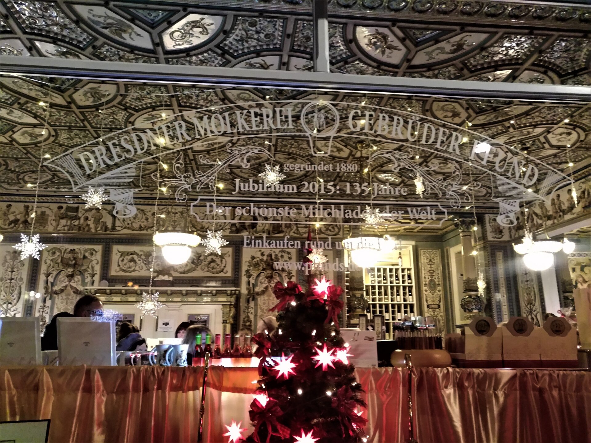 12. Нам повезло увидеть город украшенным. И повезло побывать в молочном магазине братьев Пфудс. Плитка из мейсенского фарфора на стенах, гордость Саксонии.Мы все активно фотографировались, хотя там запрещено.Поэтому фото смазаны. Нам сделали замечание. Купила открытку на память.И гордо удалилась, чтобы продолжить фотографировать витрины. Это был последний город в туре, так было грустно уезжать...последний кадр из автобуса ....