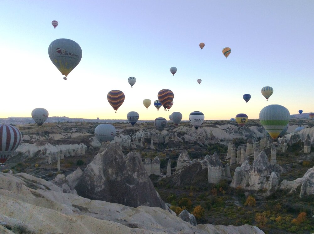 Самый красивый день и самая потрясающая смотровая площадка ждала нас в день отъезда с Каппадокии. Шары на третий день нашего прибывания в Каппадокии все таки полетели. На смотровую площадку мы приехали рано, еще было темно и очень холодно. Но это не помешало увидеть всю красоту. Чувства просто переполняют, глядя на этот потрясающий парад воздушных шаров. Необычное, неподдельное, искреннее чувство, ничего подобного никогда не видела. Сначала было темно, мы наблюдали поднятие шаров практически в темноте, стоя над долиной Любви, где скальные образования, своей формой напоминали трубы каминов. Волшебные, сказочные виды. Времени было предельно ограничено. Что совершенно разочаровывает, конечно это скорее всего связано с отменой полетов в основные дни нашего прибывания. Далее мы отправились, еще в одну Долину Любви, я поняла, что в Гёркюндере. Дело в том, что их в Каппадокии две. Долина Любви, которая составляет 4,5 километра и долина Любви 2 протяженностью 500 метров. Итак, мы группой отправляемся в долину Любви, цена вопроса 10 евро. На самом деле вход в любую долину Любви бесплатный. Дело, даже не в этом. Мне очень было удивительно слышать от гида предложение, чтобы кто медленно ходит, не ходили на экскурсию, чтобы не опоздать, а подождали у автобуса. Пошли в долину Любви, конечно же все. Это был самый красивый, самый сказочный маршрут, и в тоже время самый галопный. Фотографировала мало, боялась опоздать. Если кто то знает достоверно, в какой долине мы были в этот день, напишите, пожалуйста. Мне все таки показалось, что видели мы две долины. На одну смотрели со смотровой площадки, а по второй прогулялись. Определить их в тот момент не было времени. Здесь уже рассвело и стало интереснее. Время бежало беспощадно. Конечно, в эти долины ехать нужно не торопясь, находится там, пока летают шары. Наслаждаться, смакуя каждую минуту. Шары летали, опускались ниже каменных исполинов, а люди находившиеся в корзинах, кричали всем на земле -"Привет!", делясь своим неподдельным, детским восторгом. Мы, с таким же рвением приветствовали их и махали в ответ. Больше всего обидно конечно тем, кто ехал сюда за мечтой и она вот так, вдруг неожиданно распалась. Каппадокия такое место, где мечты обязательно должны сбываться. Поэтому будет повод приехать сюда еще раз. Хотя для меня мечта уперлась в вопрос цены. Дело даже не в состоятельности оплатить полет, а в том, что никто меня не убедит, что такое мероприятие стоит таких денег. Тем более в Турции цены на все снизились, кроме покупки и аренды жилья и шаров. А в рассказ о 350-400 евро, в день когда полетели шары, простите, я просто не поверила. И мы прощаемся с Каппадокией.