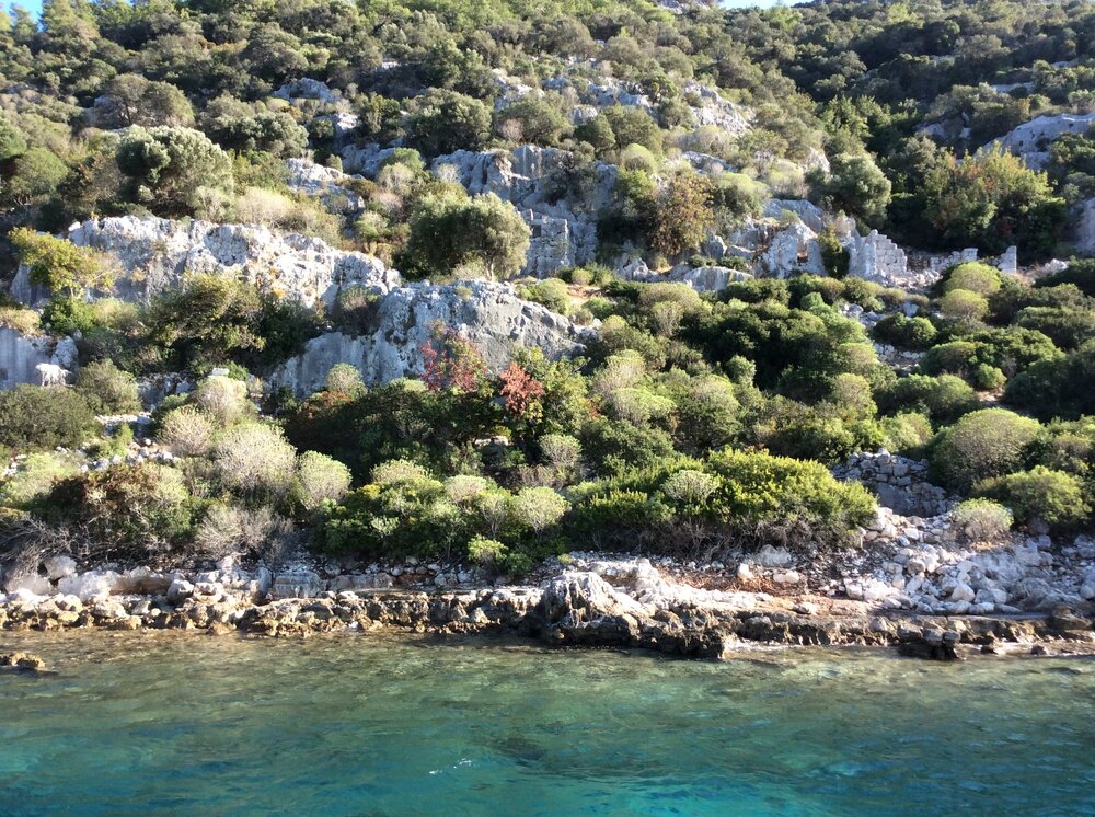 Морская расслабляющая прогулка, для ума, души и тела. На кораблике кататься собралась вроде вся группа. Почти конец октября, какого потрясающего цвета вода. Мы плывем смотреть затонувший остров Кекова, где под толщей воды со 2 века до н.э. четыре античных города скрывают остатки улиц, руины храмов, арки, дома с каменными лестницами, набережные. Вечность застывшая в камне. Это была достаточно развитая цивилизация. Уже в то время в городе строились дома в несколько этажей, бани с помывочными отделениями. Выдолбленные в скалах сечения служили цистернами для сбора пресной воды. Среди развалин можно определить, что в городе была построена система сточных вод и канализации. На небольшой глубине близ острова виден сохранившийся причал, что указывает на то, что город был портовым и торговым центром. После разрушительного землетрясения выжившие жители Кекова перебрались на противоположный остров в древний город Симену. Современное название Симены - Кале. Сейчас это маленькая деревушка с населением около ста человек. Жители как и в древние времена занимаются выращиванием плодов, ловлей рыбы. Наверно можно утверждать, что в Симене живут потомки тех самых ликийцев, в фундаментах домов которых находятся руины древнего города.