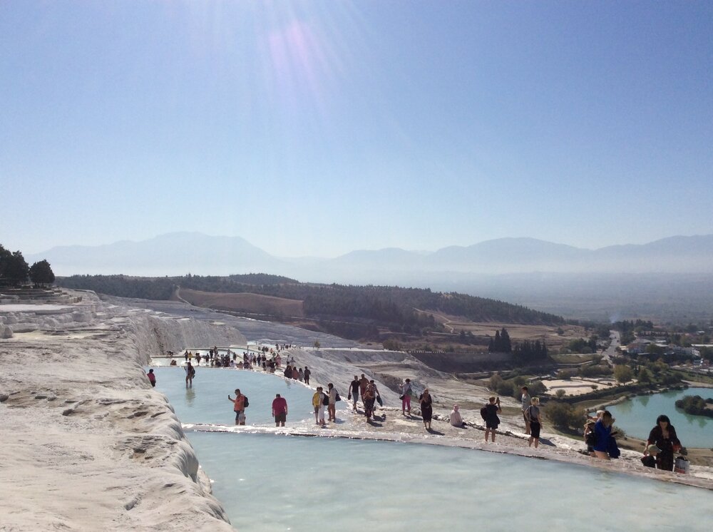 Незначительный осмотр Иераполиса настолько впечатлил, думаю, что этот античный город составляет достойную конкуренцию Эфесу. Мы уже на подходе к знаменитому турецкому термальному источнику Памуккале, содержащему карбонат кальция, благодаря которому за тысячелетия сформировались естественные террасы, ванны и сталактиты. На территории заповедника насчитывается почти два десятка источников с температурой воды от 35C до 100C, они и формируют белые террасы. Вода из источников поднимается из под земли, по искусственным руслам проходит к склону и спускается по нему в речную долину. В ходе течения воды постепенно оседает более тяжелый карбонат кальция, он со временем затвердевает, образуя чисто белые террасы. Чтобы не мешать этому многолетнему процессу, доступ посетителей сегодня ко многим источникам закрыт. Эта достопримечательность пользуется огромной популярностью среди туристов всего мира, здесь ежедневно собирается огромное количество людей. Много фотографий делается под этими террасами. Ходить или не ходить по травертинам босыми ногами выбирать каждому индивидуально. В любом случае достойное зрелище, увидеть это необходимо хотя бы один раз в жизни. В октябре нам способствовала очень комфортная погода, приятная обстановка, увидели своими глазами Восьмое чудо света, получили массу удовольствия и позитива. На выходе увидели издалека, тот самый красивый, хорошо сохранившийся амфитеатр Иераполиса. Сейчас очень жалею, что не увидела его вблизи.