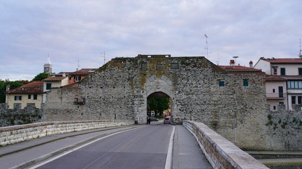 18. Дальше в сторону центра идти не очень комфортно, по Аппиевой дороге проносятся машины и автобусы, а тротуар максимум полметра шириной, местами он просто обозначен полосой на асфальте. Но впереди есть ещё пара интересных мест, так что придётся идти, да и с общественным транспортом тут туго, остановок почти нет. И вот мы выходим к небольшой церкви, официально она именуется Санта Мария ин Пальмис, но все её знают как Quo vadis?, она же Кво вадис?, она же Камо грядеши?. И тут многие вспомнят роман Генрика Сенкевича и фильмы по этому роману про первых христиан Рима. Да, по преданию на этом месте апостол Пётр, бежавший из римской тюрьмы во время нероновых гонений на христиан, встретил Христа, идущего в Рим и спросил его - Господи, куда идёшь? На что получил ответ, что в Рим на повторное распятие. Пётр попросил у Христа идти с ним, вернулся в Рим и был предан казни как и многие другие христиане. От первого века в церкви ничего не осталось, нынешнее здание было построено в 17 веке В оживлённой части Аппиевой дороги сохранилось совсем мало античных памятников, ведь чем ближе к городу, тем активно использовались земли. Но кое-что всё же встречается. И мы выходим к воротам святого Себастьяна, которые в девичестве носили название Порта Аппиа, это самые впечатляющие ворота Аврелиановой стены. Пока Рим был мощным и безостановочно расширялся, никому и в голову не приходило, что ему нужны укрепления. Войны шли на далёких границах, армия была мощна своими легионами и столице ничего не угрожало. Но ближе к закату империи уже не было надежды на несокрушимые легионы и в конце 3 века началось грандиозное строительство стен длиной почти в 20 километров, насчитывающих почти 400 башен. В начале 5 века стены сделали вдвое выше, но это не помогло, совсем скоро Рим пал. И это циклопические сооружение, кажущееся таким мощным, стало свидетельством слабости и немощи гибнущей империи. Сразу за воротами стоит арка Друза, которую раньше считали триумфальной аркой в честь Друза, приемного сына Цезаря. Впрочем, потом выяснилось, что она не в честь Друза и даже не триумфальная арка. Это арка от акведука, построенного в начале 3 века и подводившего воду к термам Каракаллы. В воротах есть небольшой музейчик стен, мы подошли, я подёргал двери - закрыто. Внезапно щёлкнул замок и двери открылись. Поднимаюсь на второй этаж по крутой лестнице (Лена осталась внузу отдыхать), там касса музея и две болтающих тётушки. Спрашиваю, можно посетить музей? Они со вздохом отвечают, что можно, но через полчаса музей закрывается на сиесту. Так вот почему они уже двери закрыли. Я говорю, что успею, мне дают билетик (вход бесплатный, но обилечивают, наверно, для статистики). Музей здесь не коллекция экспонатов, экспонатом являются сами стены и башни. Но пройти по стене можно буквально на сотню метров. Вот оттуда мы пришли, это Аппиева дорога, уходящая на юг