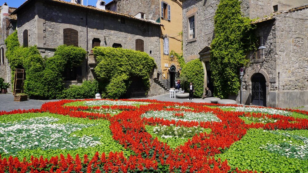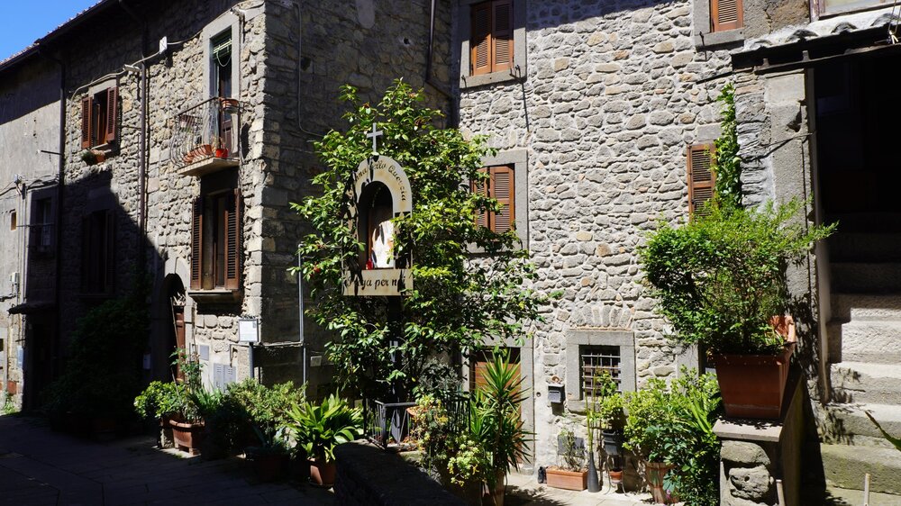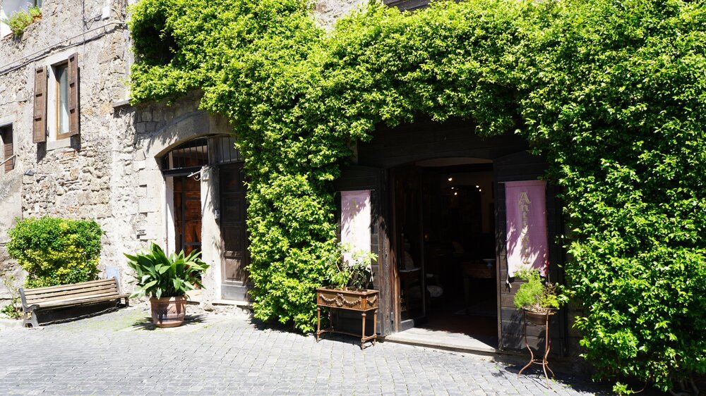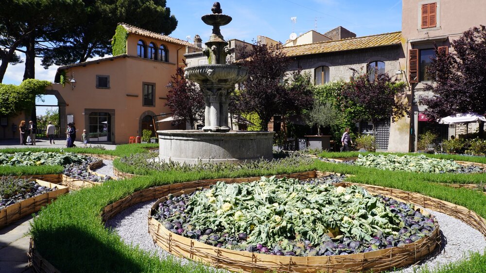 6. После Фраскати мы наконец-то переходим к интересной части сегодняшней программы и едем в городок Неми, маленький борго на вершине кратера древнего вулкана. Здесь таких кратеров немало, в большинстве есть озёра, а склоны, богатые минералами, используются для выращивания разных вкусных штук. Вот вокруг озера Неми выращивают особый сорт клубники (я знаю о споре что такое клубника и земляника, но местные не различают и всё красное круглое сладкое называют клубникой), которому в городе всё посвящено. Вообще это, конечно, борго, то есть каменный городок на возвышенности, но не такой, как я люблю,он абсолютно туристический, на первых этажах всевозможные магазинчики и ресторанчики, но я был рад видеть и такой. Высадили нас на площадке, откуда открывается замечательный вид на озеро и на городок. В этом озере когда-то Калигула запустил два огромных корабля, а скорее плавучих павильона, которые через какое-то время затонули. При Муссолини озеро спустили и остовы кораблей нашли, правда, озеро после этого не восстановилось и сейчас гораздо ниже, чем было раньше. Так что зеркало зелёной воды могло быть гораздо больше, но и так получается очень симпатично. Похоже, здесь проходит конкурс на Золушку ))) Группа чуть вперёд ушла, но мы её догнали в мясной лавке, куда Лена Зайцева всех завела продегустировать паркетту А вот пошла земляника и всевозможные изделия с её вкусом.