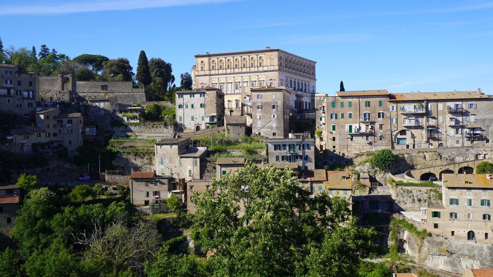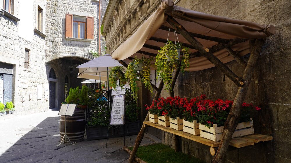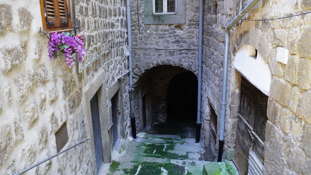 3. Дальше мы едем в городок покрупнее, но помоложе, ему всего три года, это Сермонета. Так что в эту поездку мы посетили самый старый город Италии - Рим и самый молодой - Сермонету. Высаживает нас автобус на парковке, народ офигевает, что идти далеко, да по жаре, да вверх, но Лена Зайцева всех успокаивает, что идти всего 10 минут, дорога пологая и всё равно автобусы дальше не пускают. И действительно, наш поход в город оказался лёгким и непродолжительным. Про Сермонету нечего рассказывать, ничего значительного здесь не происходило. Ну да, есть средневековый замок, который переходил из рук в руки. Вроде сюда заезжал даже Леонардо, но ничем значимым не отметился. Вот и хорошо, мы впитываем в городке не информацию, а атмосферу. Единственный минус от городка это несколько групп итальянских школьников. Итальянцы вообще очень громкие, но, как сказала моя Лена - итальянцы шумные, а дети итальянцев ещё хуже )))) Но хорошо, что эта галдящая орда была в самом центре собрана, остальной городок не пострадал.