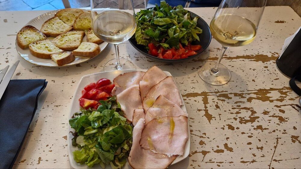 4. Так, городок закончился, мы прошли его насквозь, теперь идём обратно. Есть ещё немного времени, поэтому зашли в кафешку купить что-нибудь из десертов. Правда, первый вопрос я традиционно задал про просекко. Да, у них есть, вот вам бокальчик. И к нему Лена выбрала десерт Поели, попили, пора бежать в автобус. Вслед нам неодобрительно смотрит Калигула