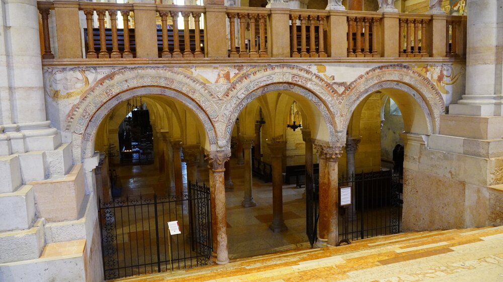 Базилика, конечно, красивая, но самое интересное скрывается под ней. Как и в прочих местах древнего города тут настоящий слоёный пирог из зданий прошлых эпох и мы спускаемся вниз, уходя в глубь времен. Жаль, что фотографировать внизу нельзя. Сначала попадаем в горомную подземную базилику, ту самую, что была разрушена викингами. И, судя по размерам и состоянию оставшегося, викинги как-то халтурно отнеслись к разрушению. В этой базилике кое-где сохранились фрески 8-9 веков и даже эти мизерные остатки очень интересны. Представляю, сколько всего необычного для современного христианина было там изображено. Вот, например, безбородый Христос Или Дева Мария, которая то ли была написана в образе византийской императрицы, то ли это изначально был портрет императрицы, который позже перерисовали. Второе более вероятно, эта фреска находится в боковом нефе вдалеке от самых почетных мест. Дальше спускаемся в лабиринт узких проходов Рима первого века на улицы и в дома, возведённые после неронова пожара 64 года. Судя по фундаментам, тут располагался большой частный дом и рядом с ними инсулы - многоэтажные дома для небогатых римлян. Часть проходов забраны решётками, видимо, настоящие катакомбы тут сильно больше того, куда пускают туристов. А вот и ещё одно интереснейшее место - зал для собраний приверженцев культа Митры, загадочной восточной религии, которая была распространена чрезвычайно широко по всей империи. Но с веками митраизм, куда допускались только мужчины, проиграл христианству. Вот она, настоящая значимость и сила женщин ))))