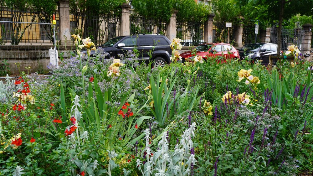 Следующая площадь и цветочная инсталляция здесь побольше Церковь Санта Мария нуова, совершенно внешне не примечательная и все туристы проходят мимо. Но я любитель заглядывать в открытые двери, поэтому мы зайдем внутрь. Это хорошая возможность посидеть и чуток передохнуть, а если повезет, то и увидеть что-то интересное. И что-то интересное здесь есть. Фрески 1293 года И алтарь 13 века. По нему понятно, почему его не забрали в музей, он явно создан каким-то не слишком профессиональным иконописцем. Так вот и стоит себе спокойно в пустой церкви. Вот ещё интересное, все капители тут разные, повторяющихся нет. А вот лучшая клумба, не только красивая, но и вкусная ))) это на пьяцце дель Джезу