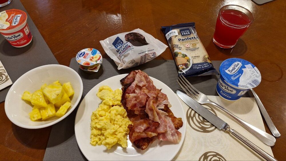 Сам городок Капрарола это одна улица тянущаяся далеко-далеко, примерно до горизонта. По бокам есть ещё и переулочки, но жизнь сосредоточена только здесь. Ложная надежда, ресторан откроется только вечером И наконец находим кафешку, официант сразу говорит, что кухня у них закрыта, но так и быть, не дадут нам умереть с голоду. И тут же на стойке нам нарубили салат и наложили индейки с медовым соусом. И ещё поджаренный горячий хлеб с оливковым маслом был изумителен. Вот теперь мы сытые, довольные и готовые ехать в отель. Да, итальянцы не перерабатывают.