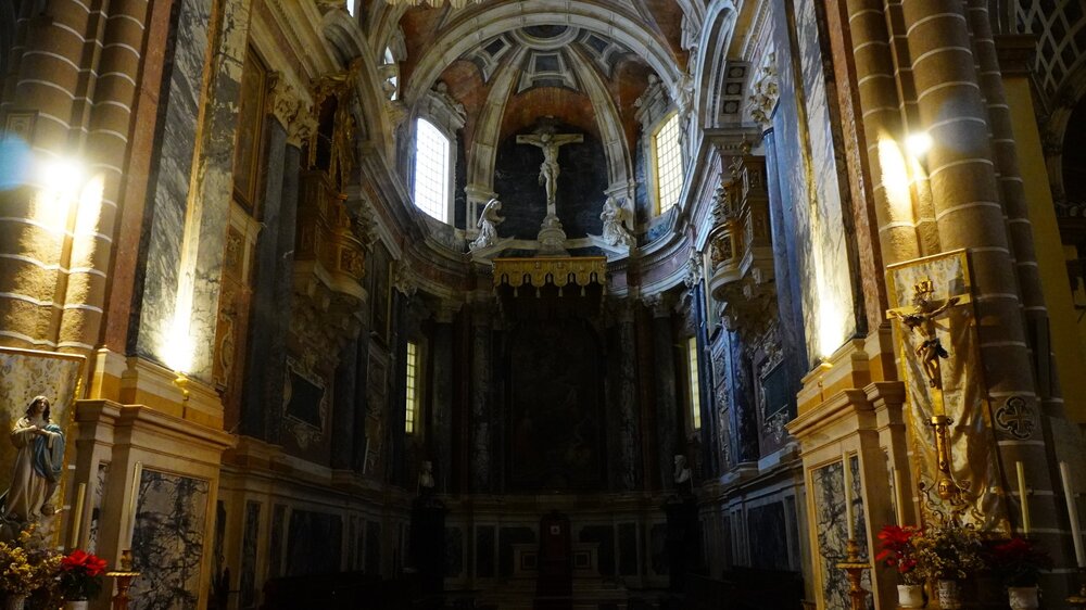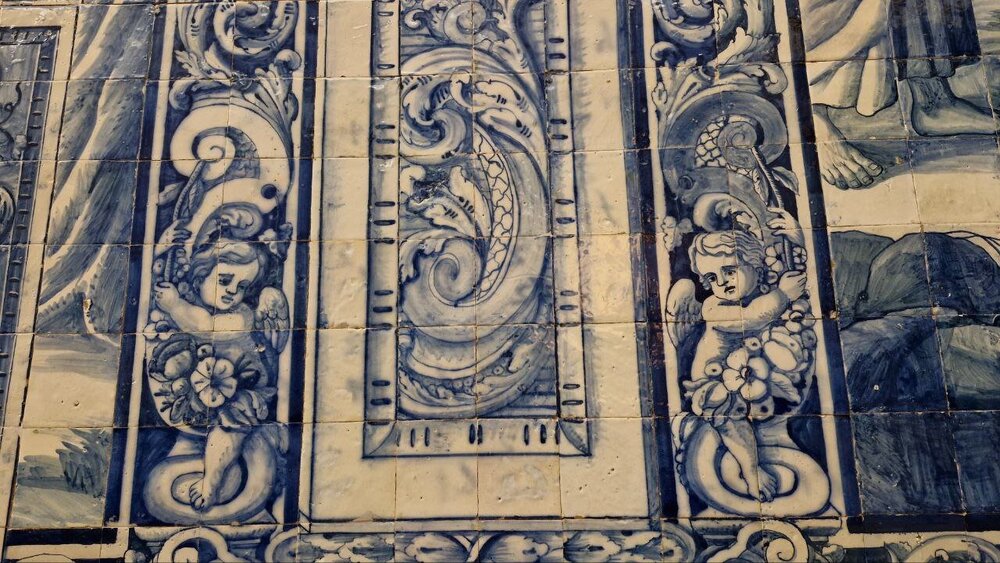 Прогулка до городу под угрозой, передвигаемся с остановками, задача-минимум пообедать, задача-максимум ещё хоть что-то увидеть по пути. Увидели открытые двери, зашли в церковь Носса Сеньора ду Карму. За 1 евро можно подняться в часовню на хорах, вообще тут это популярно было, аналогичная была в монастыре клариссинок в Порту Заходим в старый город