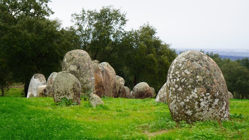 И напоследок зашли в паштелерию попить кофе с паштелями. Кафе здесь такие, что глаза разбегаются, столько всего вкусного и привлекательного, выбрать невозможно Нет, это не морковный торт, это стружка из карамелизированной апельсиновой цедры ))) Дальше мы едем посмотреть очередное интересное место, кромлех мы уже видели, теперь надо посмотреть дольмен - каменную гробницу, собранную из огромных каменных глыб. Здесь много дольменов разного размера и степени сохранности, поэтому выбираем самый большой и красивый, дольмен да Орка. Но попасть к нему оказывается непросто, сначала нас навигатор попытался завести в узенькую грунтовку между каменными изгородями, следующая грунтовка оказалась стиснутой колючими кустами и только третий вариант оказался вполне нормальной, широкой и ровной грунтовкой. Дольмен состоит из погребальной камеры примерно 2 на 2 метра и хода к ней, выложенного камнями поменьше Место для дольменов выбрано учень красивое, в сосновом лесу с открывающимся видом на долину- Новогоднее путешествие к океану. Испания-Португалия 2024.