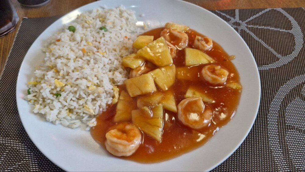 Набережная тут интересная, между домами и через них проложены проходы, где есть магазинчики, кафешки и ресторанчики. Туда-то мы и направляемся, уже пора пообедать Заходим в первый попавшийся ресторанчик, оказавшийся внутри интересным. Слева обедает семья владельца, вон он сам сидит в светлом пиджаке. Мы его узнали, так как он же изображен на многочисленных фотках с какими-то местными знаменитостями, которыми увешаны все стены Заказали 2 вида свинины, в горчичном соусе и какой-то их местный рецепт с фруктами - дыней, ананасом, апельсином. Принесли их не на тарелках, а вот так, каждый накладывает себе сколько хочет