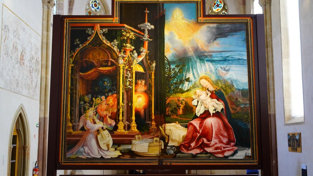 Внутри собор впечатляет размерами и деталями. Смотрите, какая красота Какая прекрасная композиция, какой глубокий смысл - каким бы ни был утончённым модником, смерть всё равно за тобой придёт )))) Тем временем очень скромно начинается месса. Служит её архиепископ Трира, а мы стоим и думаем, что вот предшественники этого человека осаждали замок Эльц и делили замок Турант. Заглянули в клуатр собора