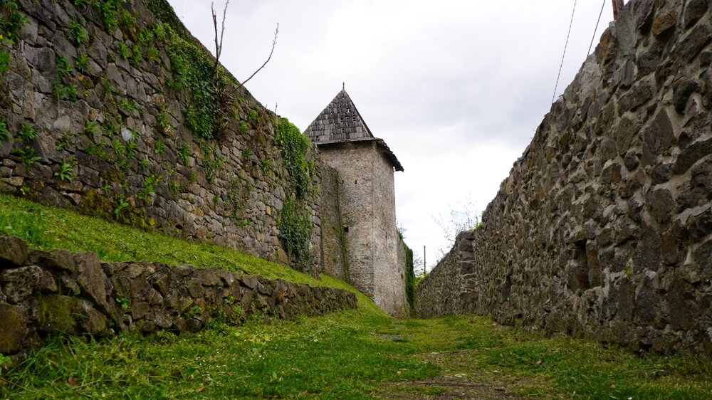 Очень редкий для Боснии памятник - средневековая церковь святой Марии. Она была построена примерно в 12-13 веках и в 15 веке обновлена в готическом стиле. Именно в этой церкви венчался на царство последний боснийский король. После захвата османами церковь переделали в мечеть, а восле пожара 1832 года, когда здание выгорело дотла, забросили и вот так оно и стоит до сих пор. От церкви начинается подъем к крепости Яйце на вершине холма. Вход в крепость неожиданно платный, правда, стоит всего 2 марки, билет можно купить в будочке перед воротами. Эхо войны (с) Внутри пусто и симпатично, развалин нет и вся внутренняя часть представляет из себя зелёную лужайку. Вон внизу церковь святой Марии и справа Медвежья башня Новая часть города