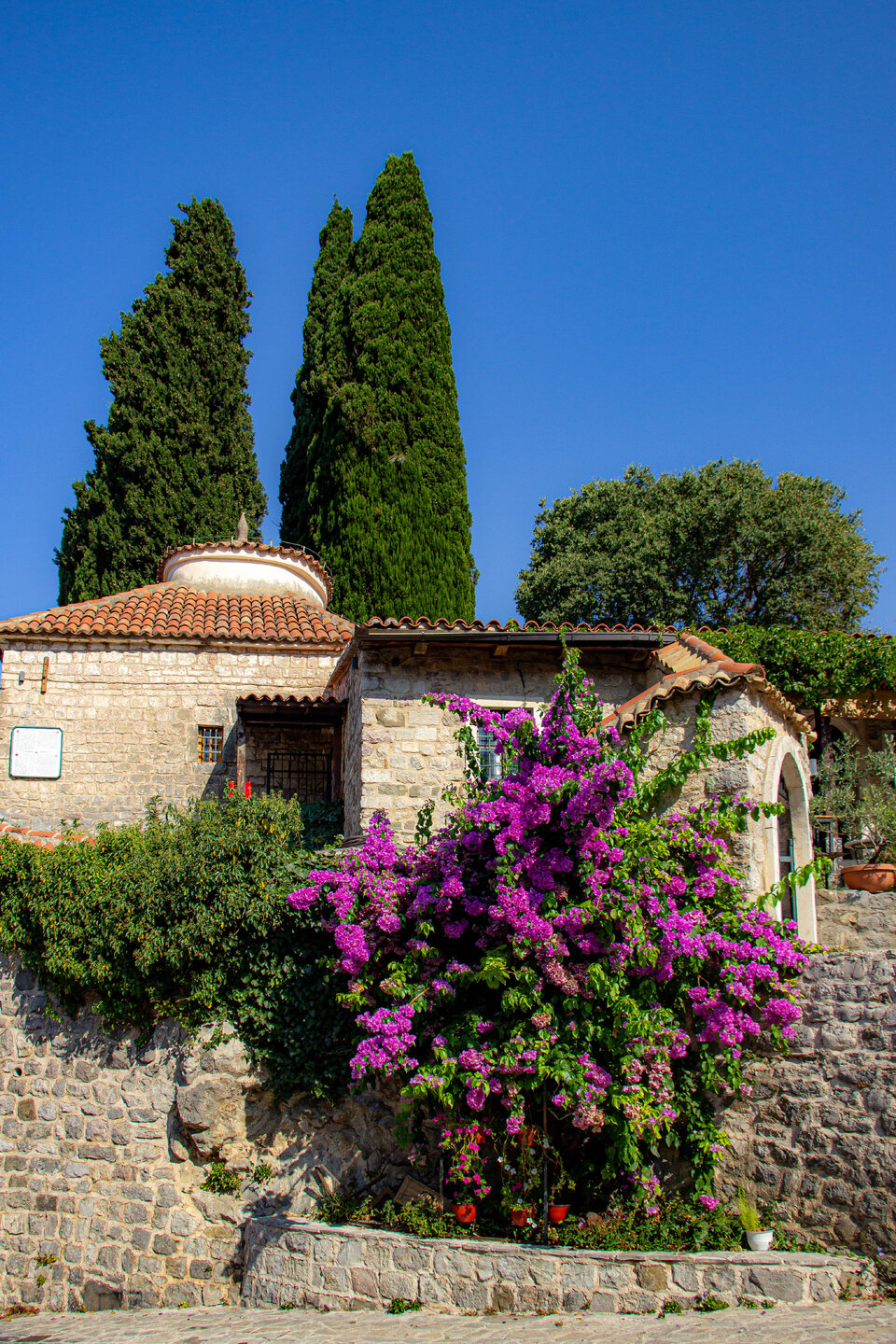 Пора погулять немного и по острову и посмотреть на эту церковь вблизи. Снять ее без этого огромного количества людей просто нереально! Только нацелишься - вдруг чьи то ноги, руки, головы, тела войдут в кадр. Ну что я хотела - это ведь высокий сезон и очень раскрученное и святое место. Терпеливым иногда везет немного - удается снять без людей на переднем плане, но на это уходит уйма времени На том балкончике и я пофоткалась с удовольствием, спасибо Елене. Отсюда было отлично видно соседний остров - кажется, до него рукой подать, расстояние то между островами всего лишь 115 метров. Пришла пора и про него пару строк черкнуть, Галина нам про него ничего не рассказывала, лишь сообщила, что на него нельзя попасть, он закрыт. А почему? Всю информацию пришлось поискать самой на просторах инета. Этот остров известный и как остров Святого Георгия примечателен тем, что на его широком каменном утесе стоит одноименный храм, в котором когда-то давненько располагалось бенедиктинское аббатство. За свою долгую историю аббатство на острове пережило немало потрясений, но всегда возвращалось к своему первозданному виду. Сейчас церковь выглядит практически также, как и много веков назад, не считая некоторых деталей. В исторических документах аббатство на острове Святого Георгия впервые упоминается в 1166 году как собственность Котора. Однако, ученые, изучив сохранившиеся фрагменты первоначального убранства, пришли к выводу, что построено аббатство было гораздо раньше - уже в 9 веке! Остров и бенедиктинский монастырь на нем оставались под контролем Котора до первой половины 17 века, после чего, как и вся бухта, перешли под управление венецианцев. Остров неоднократно подвергался разрушениям и испытаниям, и все же, небольшая церквушка на острове выстояла и дожила до наших дней. В 1571 году турецкий пират Карадоз почти полностью разрушил остров, сжег и аббатство, и город Пераст. Восстановление началось лишь в 1603 году. В 1654г аббатство стало жертвой турецкого набега. А в 1667 году остров и монастырь на нем сильно пострадали от землетрясения, были серьезно повреждены потолок и апсида церкви. В 1812 году остров захватили французские войска, но их власть длилась недолго - всего пару лет спустя, в 1814 году правление перешло к австрийцам. После освобождения страны от оккупантов остров вошел в ее состав, стал частью Югославии, а после - современной Черногории. В наши дни аббатство не является действующим, и остров закрыт для посещений. Еще его называют Островом Мертвых. Связано это с тем, что долгое время на острове хоронили знатных горожан и морских капитанов Пераста. Только в 1866 году, когда в самом Перасте было построено новое кладбище, на острове прекратили погребение. Многие жители Пераста считают, что острова рядом с их городом отождествляют мужское и женское начало. Остров Святого Георгия - закрытый, мрачный, носящий нотку официальности - символ мужского, а остров Богородицы на Рифе - открытый, светлый, кокетливый, парящий - женского начала. Еще есть один обычай, связанный с островом. Сюда можно приплыть и примириться со своим обидчиком. Для этого на острове есть площадь примирения, на которой в течение долгих лет тут собирались поссорившиеся люди, чтобы начать диалог. Из-за святости места никто не мог обидеть другого ни словом, ни действием, поэтому многие проблемы, с котор