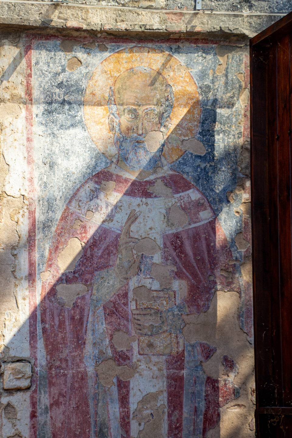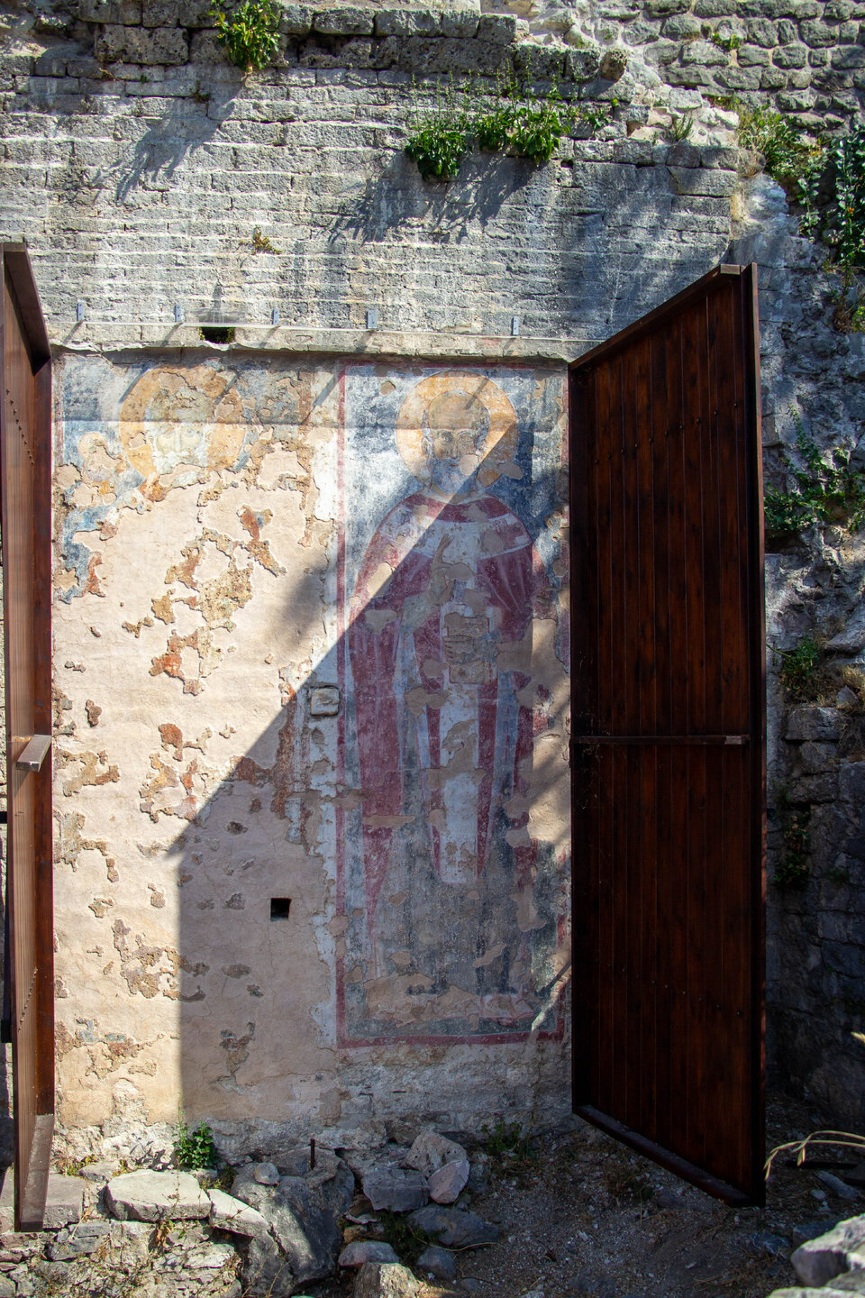 Сначала у нас была остановка внизу, чтобы мы смогли посетить туалет, заказать обед из предложенного меню, который будет у нас после посещения Острога, и прикупить сувениры в местной лавке, в которой туристам давали скидки, следовало лишь сказать волшебные слово - Галина (это наш местный гид). Все сувениры здесь освященные продают. Я решила не заказывать ничего на обед из горячих блюд, салат и супчик можно было потом быстро получить и съесть, пока группа обедала. Первым делом я зашла в сувенирную лавку - там пока совсем было пусто и меня встречали как дорогую гостью. Все сувениры были в моем распоряжении. Я выбрала пару маленьких иконок с Василием Острожским. К ним мне выдали по маленькой карточке с его же изображением в придачу, пару плетеных браслетиков "на здоровье" и "на удачу". Здесь же продавали и сыры, и черногорский пршут, все можно было попробовать. Пршут в основном был большими кусками в вакуумной упаковке. Я все попробовала, очень вкусно все было. Но куски были большие, дома тонко бы не получилось нарезать, поэтому я выбрала в нарезке. Муж как всегда не оценил, ну и не надо, я и сама не плохо справилась с пршутом в одиночку. Хочу сразу сказать, что те кусочки , что давали на пробу были на мой взгляд вкуснее и не такие соленые, как моя нарезка. Ну а теперь про сам монастырь пора несколько слов молвить и фото приложить. Монастырь находится внутри горы Острошка Гряда. Это крупная отвесная скала, на которой и расположен монастырь на высоте около 900 метров над уровнем моря практически вертикально над долиной. Высеченный в отвесной скале, монастырь Острог напоминает собой белую птицу, присевшую высоко-высоко в горах на невидимой, но крепко держащей ладони. Основателем обители считается один из самых почитаемых сербских святых – Василий Острожский, здесь и хранятся его мощи. А первыми насельниками горных пещер были отшельники, выбравшие эти места, чтобы в молениях и подвижничестве проводить уединённую жизнь. В Верхнем Острожском монастыре находятся две пещерные церкви: одна – во имя Введения во храм Пресвятой Богородицы, где хранятся мощи св. Василия Острожского Чудотворца; над ней вторая – во имя Честного и Животворящего Креста, построенная и расписанная ещё при жизни святого Василия. Пещера некогда служила келией преподобному Исайе Оногоштскому и стала храмом по воле святого Василия.Точная дата основания Введенской церкви, в которой находится рака с мощами святого Василия Острожского, неизвестна. Мы поднялись по лестнице к Введенской церкви и переступив её порог, оказались в притворе, который в 1774 году, по благословению игумена Иосифа Бошковича, пристроил монах Михаило Васоевич, в память о себе и своих родителях. Сделав ещё шаг, преклонив голову прошли за низенькую дверь, чтобы приложиться к мощам святого Василия Острожского. Рядом находился священник, с крестом в руке. На фото ниже можно увидеть раку с мощами. В наш визит похожий священник сидел возле раки на том самом стуле, больше похожем на трон, с крестом в руке, к которому, как и к раке, можно было приложиться челом для благославления. Затем мы поднялись в верхнюю церковь. В сувенирной монастырской лавке можно было купить разные иконы и прочие сувениры. Я здесь приобрела брошюру за 4,5 евро, в которой описываются житие Св. Василия Острожского, история монастыря и чудеса святого 