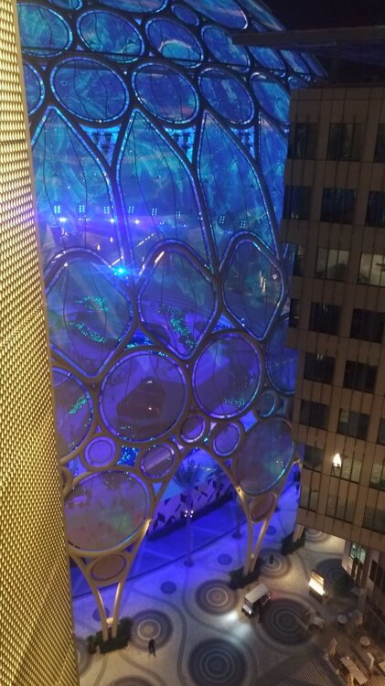Мы приезжаем к отелю, который расположен прямо на территории международной выставки Экспо 2020. Там еще перед Рождеством открылась праздничная ярмарка и многие гости и жители Дубая стремились ее посетить. Пока заселяюсь время близится к Новому году) Сын забронировал мне соседний номер, что очень удобно. Номер на 11 этаже, на 12 уже крыша с бассейном. Номер очень хороший, большой, с балконом выходящим на Главный выставочный купол, где все праздничные дни шли бесплатные световые шоу и различные представления, музыка начинала играть с 8 утра и прекращалась в 12 ночи, но мне это даже нравилось!!! Немного разбираю вещи, переодеваюсь и мы идем гулять по территории выставки, но сначала мы поднимаемся посмотреть бассейн в ночной подсветке. Купол возле отеля сразу поразил, при входе в него стояла огромная ёлка, которую охраняли такие же огромные щелкунчики, всё настроение новогоднее) Мы решаем не тащиться в городскую толпу, а остаться в Новый год на Экспо, тем более нас ждет отсчет времени и световой салют!