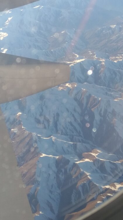 Лететь было комфортно, самолет большой с довольно удобными креслами и развлечениями в виде фильмов и игр на экране впереди стоящих кресел. Еще Аэрофлот развлекал напитками и обедом, детям в честь праздника вручали рюкзаки с подарками, отчего я тоже хотела сказать, что мне пять лет) Моя соседка еще была на высоте, она создавала настроение всему самолету, так как у девушки на голове был милый ободок с елочкой, представляете я летела рядом с "Ёлкой"))) Ну и место у окна - это тоже развлечение. Хотя сначала кроме облаков и яркого солнца ничего не было видно, потом мы долго летели над Каспийским морем и вдруг оторвавшись от просмотра "Служебного романа" ("Иронии судьбы" почему-то не было в меню) посмотрела в окно и увидела горы... да такие красивые, казалось что их каменистые и покрытые снегом верхушки так близко, что самолет вот-вот заденет их пузом! Меня сразу заинтересовало, что это за горный массив, с фильма быстро переключилась на онлайн карту полёта и поняла, что мы летим над Ираном. Уже позже посмотрела в интернете, это Иранское нагорье видимо было. Но очень завораживающе выглядели эти горы! Солнце начало закатываться и я не могла оторваться от этого зрелища, постепенно стемнело. Самолет начал снижаться, а за окном появились огни большого города. Ну, здравствуй, Дубай!