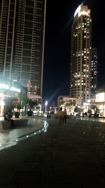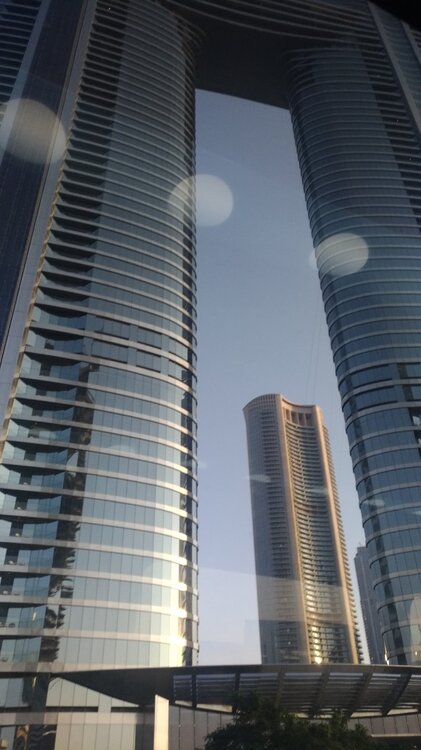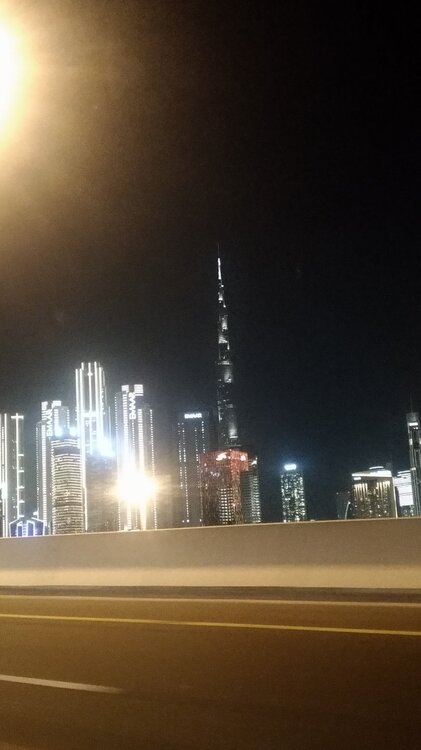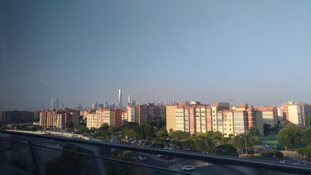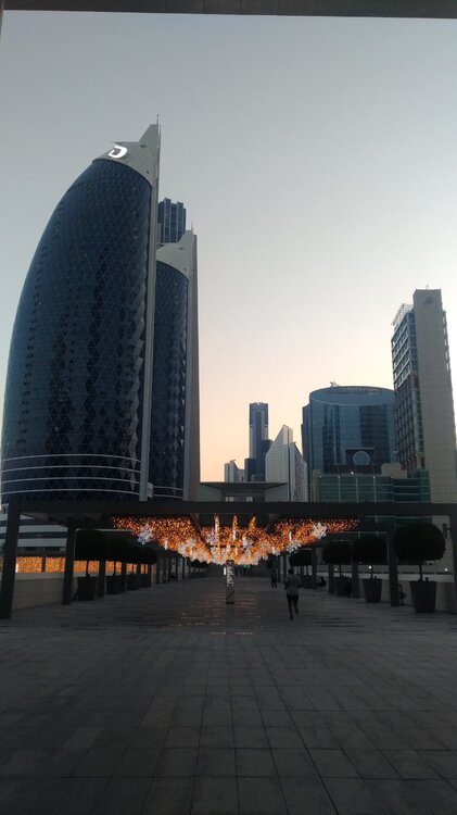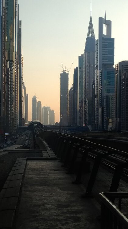 Самолет приземлился с опозданием, так как и вылетели мы немного позже, в Шереметьево у самолета обрабатывали крылья ото льда, ну такая была странная погода в Москве. Когда приземлились я подключила роуминг, чтобы быть на связи. Сообщила сыну о прилете, он уже был в аэропорту и спрашивал в какой терминал мы прилетели. Ну а мне откуда знать?))) Я вышла из самолета и по любимому принципу "следуй за толпой и она тебя выведет" направилась за людьми. Вниз, вверх, эскалаторы, ступеньки и вдруг работник аэропорта начал всех зазывать на какую-то платформу. Что за подстава? Начала спрашивать у соотечественников куда нас собираются везти, они отвечали, что сами не знают, но другого варианта видимо нам не предлагалось. Пришел поезд, сели, поехали и довольно далеко. В дороге я подумала о багаже, а как же его доставят туда, куда нас привезли? Вышли из поезда и снова толпа уверенно пошла куда-то, а я за ней! И вот паспортный контроль с огромной очередью змейкой. Здесь уже перемешались пассажиры с разных рейсов. Ну вроде всё пройдено, там надо было посмотреть в камеру при проверке документов, а так всё как обычно, виза получена) Осталось найти багаж, если он конечно доехал в этот терминал))) Нашла табло с рейсами и нужными лентами багажа и пошла к ним. По пути начались магазины Дьюти фри, заглянула в один - цены бешенные даже по сравнению с Шереметьево. Пока шла к ленте оказалось, что наш багаж добрался быстрее нас и уже первые чемоданы катались по кругу. У одной попутчицы попыталась узнать, что это за терминал, она сказала, что скорее всего первый. Написала сыну, он тоже ждал меня в первом. Тут вижу вроде мой чемодан, только приготовилась его поймать, как вдруг его берут арабы в своих белых одеждах, я аж напряглась! Но они его покрутили и поставили снова на ленту, мои ленточки на ручках их смутили видимо. А если бы не смутили? Так бы и ушли с ним?))) Хватаю свой любимый чемоданчик и по стрелкам Еxit направляюсь к выходу. Сквозь стекло уже вижу сына, ну наконец-то дошла, квест пройден!!! Обнимаемся и идем на стоянку такси. В городе перед новым годом ажиотаж, главное шоссе - улица шейха Зайеда перекрыли с шести вечера из-за боязни столпотворения у башни Бурдж Халифа, центральная станция метро также закрыта, такси везет в объезд но основные высотки видны!