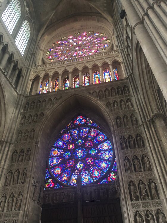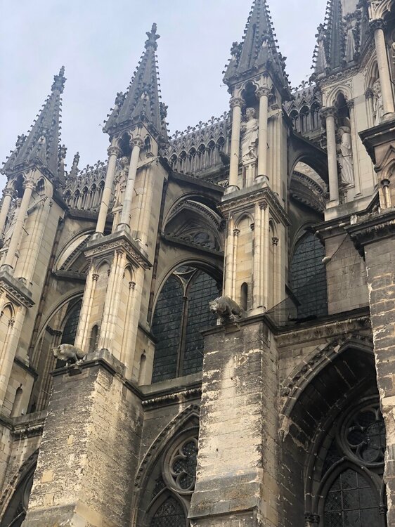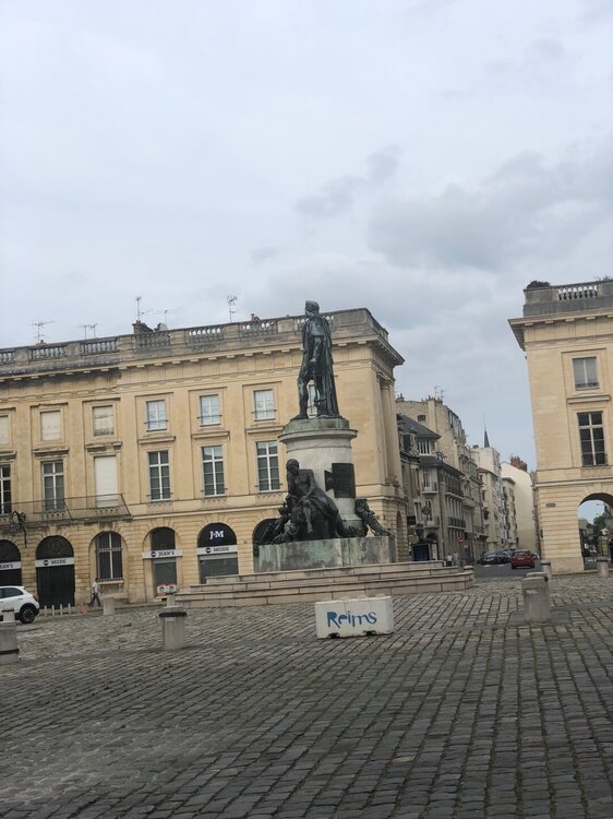 До Реймса от Парижа ехать примерно 140 км, поэтому днём мы уже въехали в город. Мест на подземной парковке отеля не оказалось и пришлось искать городской паркинг, он оказался не так далеко, но время лишнее пришлось потратить, и только после этого мы заселились. Окна номера выходили на собор, не то, чтобы прям совсем напротив, но было видно. Мы сходили в Монопри, который был прямо напротив отеля, купили еды и перекусили в номере. А затем началась наша прогулка по очень милому городку, который видел столько царских особ! Реймс расположен в регионе Шампань, поэтому тут можно попробовать настоящее шампанское, но мы почему-то это не сделали. Сын не фанат шампанского, а мне бутылку выпить за вечер конечно реально, но не комильфо как-то. А с собой я решила бутылки не везти вообще, итак вечно багаж зашкаливает).И еще в Реймсе продают розовые конфеты и розовое печенье по особой Реймовской рецептуре, есть даже специализированный магазин по продаже этих розовых сладостей. Но в том же Монопри они тоже есть и дешевле. Наш отель стоял прямо в центре пешеходных улиц рядом с фонтаном Субэ. ("Он был построен на личные средства торговца Огюста-Фредерика Субэ в 1906 году, в стиле модерн. Высота фонтана 17 метров, он украшен аллегорическими фигурами, изображающими местные ресурсы. Наяды символизируют реки. Меркурий — Торговлю, он окружен виноградной лозой, Промышленностью, Сельским Хозяйством и Реймсом в образе Женщины в короне — Крылатой Победы. Фонтан был разрушен в 1942 году, только в 1963 началось восстановление, которое затянулось на десятилетия, и закончилось только в 2016 году."). Вот к этому фонтану мы и вышли сначала. Там записали видеопоздравление для племянницы ко дню рождения и потом уже пошли дальше. Город хоть и небольшой, но по нему ходит множество цветных автобусов и проложена длинная сеть трамвайных путей. Сын зашел в единственный Макдак в городе за кофе, а я пробежала по ближайшим магазинам, пока они еще были открыты, ничего не купила, но было интересно, затем побродив по центральной улице мы свернули к собору, он действительно прекрасен и внесен в список объектов ЮНЕСКО. Там короновали 25 монархов! Там была сама Жанна Дарк. Собор хорош и снаружи и внутри, мы зашли в него, когда вдруг неожиданно часы пробили ровно 5 или 6 вечера, не помню уже точно и на часах внутри собора началось коротенькое представление - это было очень неожиданно, ну мы все знаем много таких уличных часов с представлениями - Нюрнберг, Мюнхен, Берн, но вот чтобы внутри старинного собора... Это очень большой собор с красивыми витражами и в нем очень комфортно находиться. Но выходить пришлось, надо было дальше смотреть город.