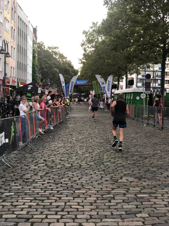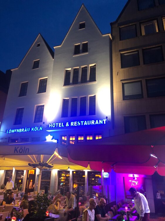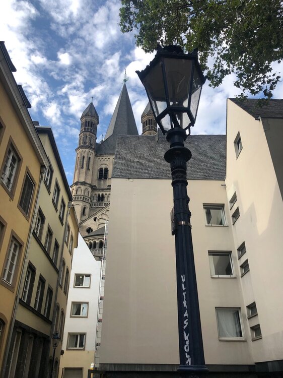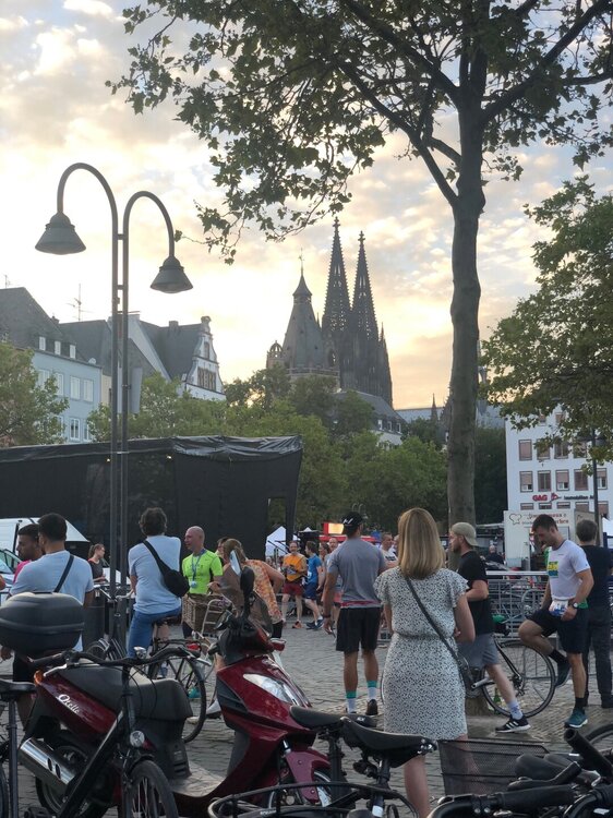 Часть набережной была перекрыта, но мы все равно пошли к Рейну, ведь на набережной стояли такие красивые старинные домики. Спортсмены продолжали бежать, хотя на город уже спускались сумерки. А мы решили перекусить в одном из ресторанов. Была пятница и народа везде хватало, гуляли, пили пиво, ели и смотрели на ведущих правильный образ жизни бегунов, хотя кто знает, может сразу после забега они тут же шли в ближайшую пивную?))) затем мы по набережной дошли до Кельнского собора, а ещё посмотрели на прекрасный железнодорожный мост. Решили, что на другую сторону Рейна пойдём по этому мосту завтра, а пока обошли собор, про который я столько слышала и очень хотела увидеть его собственными глазами. Но сказать что он очень сильно меня впечатлил не могу, видела и покруче ну или просто зажралась))) было уже поздно, внутрь не пускали, понятно, и это мы тоже отложили на завтра, а пока спустились к ж/д вокзалу, который располагался рядом, ведь там ещё работали магазины, а нам надо было купить продукты и бутылочку местного вина конечно же) Кёльн поразил большим количеством бомжей и разных маргинальных личностей, они спали прямо под козырьками бутиков на торговых улицах, шлялись везде в непотребном виде и очень портили впечатление о городе. Идти в темноте к отелю из-за них в этот день не хотелось и мы решили сесть на трамвай, правда он не довез нас одну остановку и поехал в парк, пришлось немного пройтись)