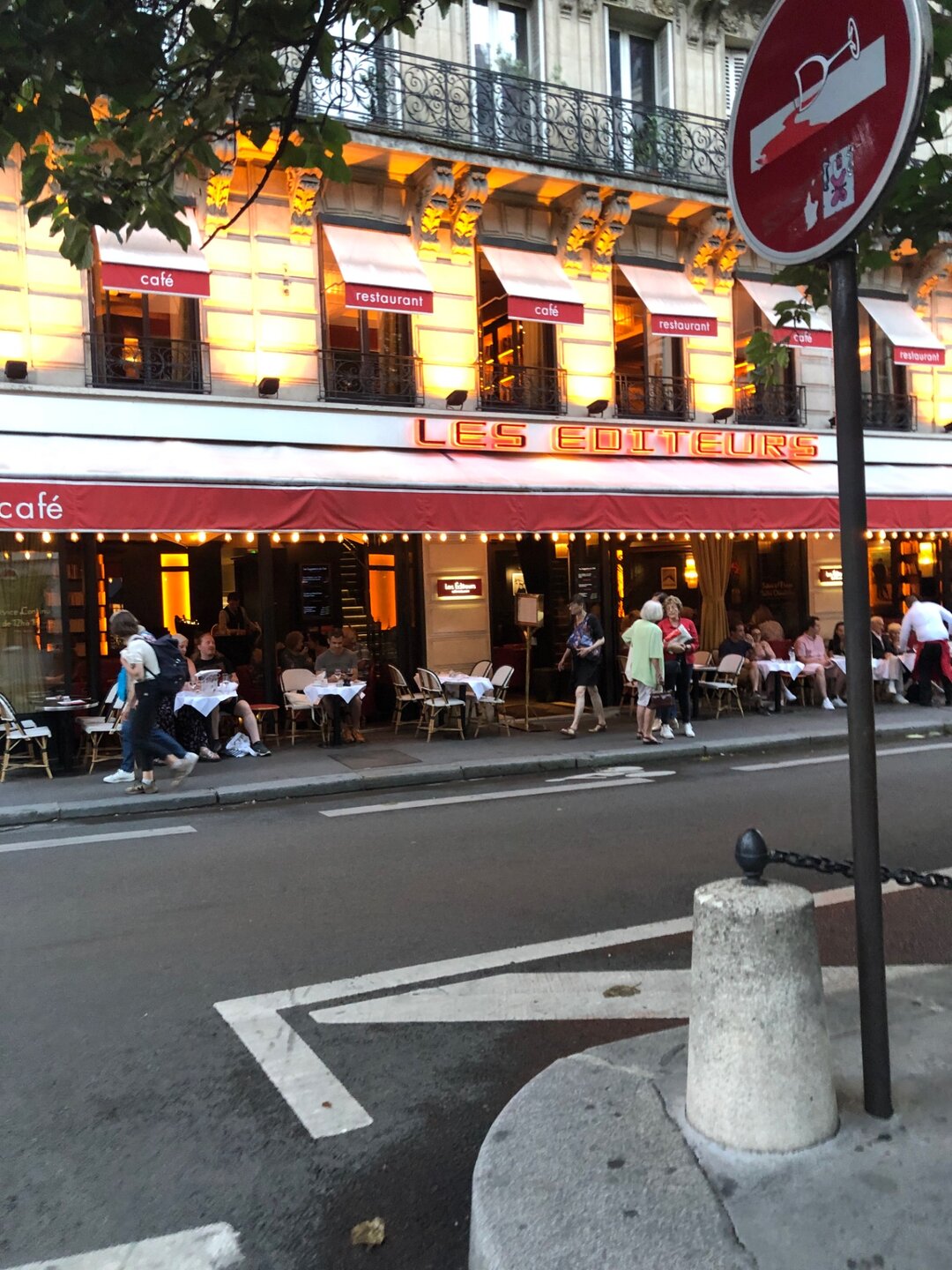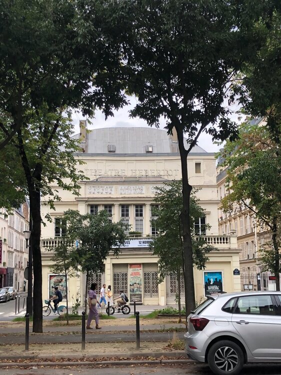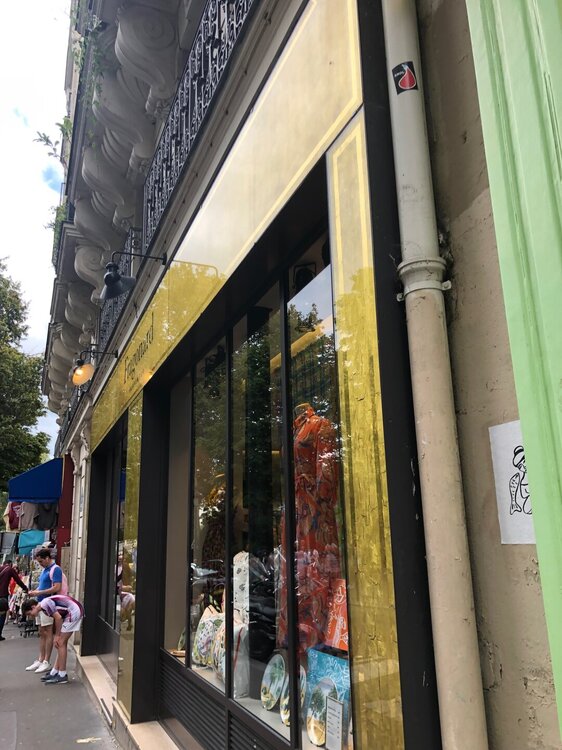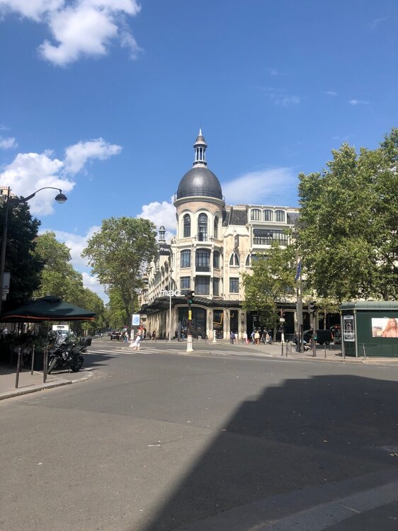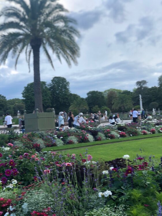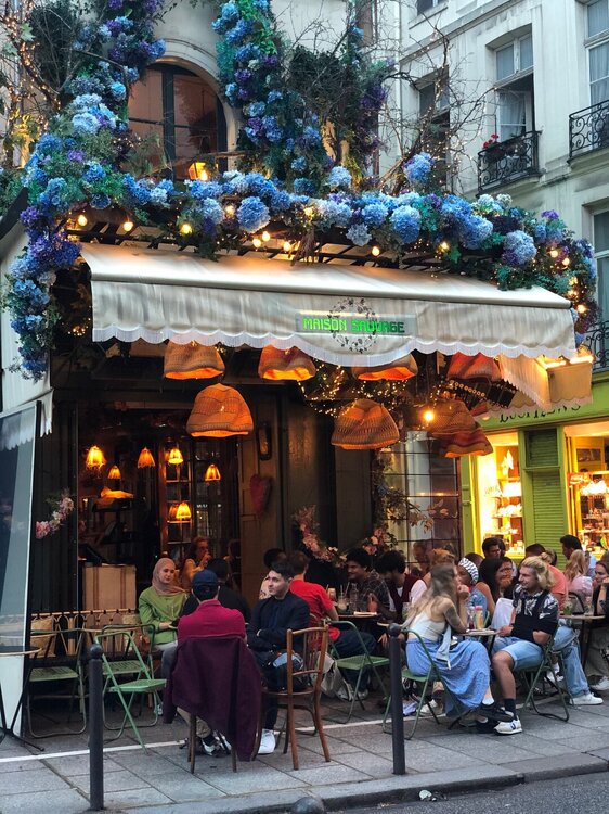В Люксемургский сад мы зашли через ближайшие ворота и пошли по аллее к фонтану. Сад был как всегда прекрасен и оттуда не хотелось долго уходить. В саду было много отдыхающих, они читали книги, сидя на зеленых стульчиках или просто созерцали красоту вокруг. Как позже рассказала нам Оксана, эти стульчики сейчас бесплатные, а когда то были платные и Марина Цветаева, например, не могла себе позволить на них посидеть лишний раз. Но самое главное кораблики, маленькие и побольше до сих пор запускают по глади фонтана перед фасадом дворца. Если бы не ливень, который застал нас по дороге и отнял довольно много времени, то прогулка в саду получилась бы более длинной и неторопливой. Но мы не могли опаздывать на встречу. Поэтому через некоторое время прошли к другому выходу, издалека окинули взглядом Пантеон и направились на ту точку, которую нам обозначила Оксана. Перед входом в заведение, как и полагается стояли столики под тентами, за одним из которых я заметила знакомую фигуру, Оксана была на месте и радостно бросилась нам на встречу. Обнимашки, счастливые лица - это всё про нас, это наши эмоции того дня!!! Мы присели рядом. Оксана прекрасно выглядит, Париж ей к лицу, и мне кажется она очень похожа на парижанку сейчас. Мы заказали вино и начались рассказы, вопросы, ответы, так душевно и мило посидели. За нашим столом был еще один клиент - пчелка. Оксана сказала, что пчел разводят в городе, это местные жители. И я вспомнила, как когда то смотрела документальный фильм о Париже, в котором рассказывали что даже на крыше Нотр-Дам де Пари стоят ульи. Ну а пока крыши нет, видимо летают где попало и к нам заглянула одна настырная, но безобидная особа )))