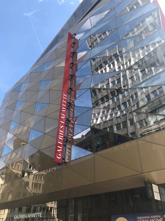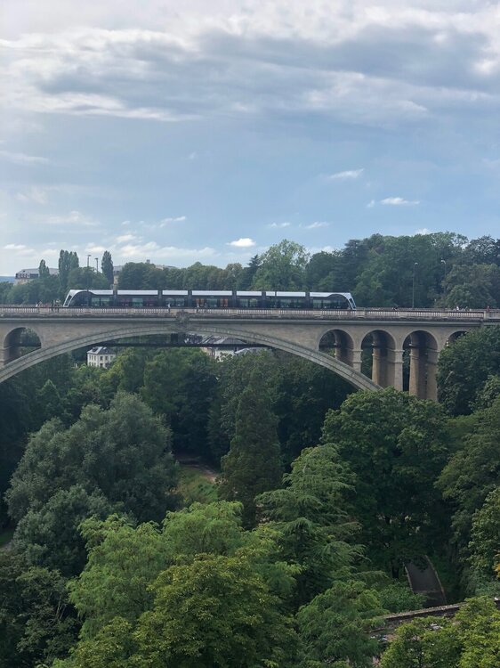 Въехали в город и направились к смотровой площадке, навигатор говорит поворачивайте, а там нет поворота, едем дальше, разворачиваемся вообще непонятно как перед трамваем и не понимаем можно-нельзя так было делать, но выхода нет)))))))) Хорошо, страна цивилизованная и к нашим кульбитам участники движения относятся с пониманием!))) Потом катаемся по парковке у смотровой - мест нет, ну так несколько кругов сделали и поехали искать куда встать. Повезло, нашли рядом подземный паркинг, там очередь. Но быстро нас пропустили, там тоже непонятно куда встать -свободны лишь места для инвалидов и для зарядки электромобилей. Ну, посмотрели, что многие эти места занимают и вслед за ними также встали - время-то идет, надо город смотреть! Я без зазрения совести захожу в первый пятизвездочный отель по пути, надо же туалет посетить))) И хоть, говорят, общественные туалеты в Люксембурге бесплатные, там их еще найти надо, а времени нет))) Транспорт тоже бесплатный, но только для местных жителей, в центре стоят автоматы с чистой бесплатной водой, такая вот цивилизация! А сразу за углом этого отеля начиналась улица, ведущая в исторический центр города. Но мы сначала идем на смотровую и любуемся панорамой города! Потом возвращаемся в центр. Город мне понравился, правда народу много - туристы кругом! Мы прошли все эти улицы вдоль и поперек, потом зашли в историческую кофейню на кофе с выпечкой. Затем вернулись к одному из мостов, где есть еще одна смотровая площадка. Сын показал оттуда отель, где жил год назад и как сложно было оттуда ходить в центр через длинный мост, лифт или кучу ступенек, потому как внизу практически пропасть! На память о Люксембурге у меня остался магнит, открытка и прекрасный шарфик лавандового цвета)
