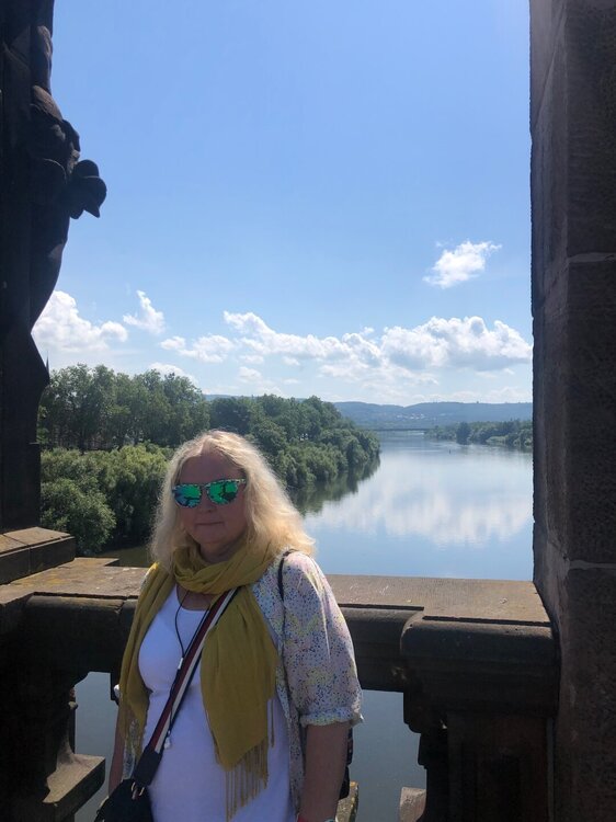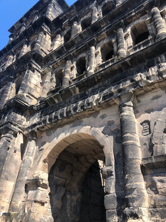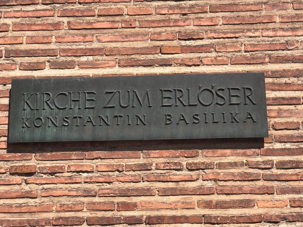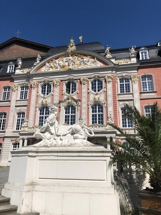 Вечером мы открыли очередную бутылочку мозельского вина, оно там прекрасно! А утром я побежала по магазинам, был у меня часик, пока сын спал и собирался. Купила крем, который всегда беру в Германии, еще одни прикольные очки, потом украшения в подарок, открытку с видом города в свою коллекцию и наконец зашла в любимый обувной магазин, который у нас теперь отсутствует. Увидела супер удобные летние тапочки, такие как были у меня когда-то, но другого цвета, а вот с размером проблемы оказались, не нашла. Решила, что надо с сыном потом зайти, он точно сумеет объясниться, может найдут мне нужный размер. На главной площади с утра работал рынок, я купила клубники, а в супермаркете молочные продукты к завтраку. Погода обещала быть прекрасной, тепло и солнечно. После завтрака в номере мы собрали вещи, отнесли их в машину, сдали ключи и отправились гулять по Триру. Зашли и в магазин, сын стал на английском говорить про нужный размер, а я что-то ему сказала и тут продавщица услышав мои слова резко переходит на русский и быстро начинает нам помогать решить вопрос) Подсказала в каком ТЦ на какой улице есть второй такой магазин и там точно есть нужный нам размер, всё четко нам записала! А я-то боялась, что меня не поймут))) Забегу вперед, самое смешное, что в том магазине половина продавцов тоже говорила на русском))) Тапочки в итоге мы купили, чем я очень довольна, ношу и радуюсь) Утренний солнечный Трир был еще ярче и краше, чем вечерний. Ну просто город-сказка! Да, не такой большой, но прекрасный, спокойный, чистый, там можно было бы "залечь на дно" - остаться, комфортно очень и душевно. Мы зашли в Трирский собор, который вечером был закрыт, потом прошли в Базилику Константина, рядом с ней находится Дворец курфюрстов и парк, куда мы направились тоже. Очень симпатичный парк, в лучших традициях садово-парковой культуры. За парком находится музей под открытым небом, вернее то, что осталось от римских терм, вход на территорию платный, но видно всё и так, заходить смысла не было. После мы немного вернулись назад другой дорогой, чтобы посмотреть на дом Карла Маркса. Ну а затем мы отправились на берег Мозеля к древнеримскому каменному мосту. Вообще Трир называют самым римским городом Германии, слишком большой след оставили в нем римляне и многое сохранилось в тех давних пор.