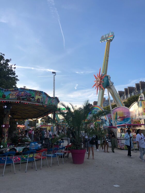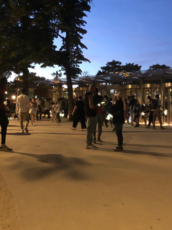 Мы засиделись, а Оксане надо было еще добраться до дома в пригород, поэтому пришлось расставаться. Она побежала на поезд, а мы как обычно потопали пешочком, но уже другой дорогой в сторону отеля. Пока мы сидели в баре периодически капал дождик, но не серьезный такой и нас не напугал. К вечеру казалось, что погода снова прекрасная. Мы шли к набережной Сен Мишель вечерними улицами Латинского квартала до краев заполненных посетителями ресторанов и баров. По набережной уже дошли до Лувра, перешли через мост к нему, полюбовались вечерней подсветкой и вышли на улицу Риволи. По пути заглянули в Макдональдс, а потом неспеша направились к площади Согласия, периодически поднимая голову вверх и разглядывая смельчаков на самых крутых каруселях в парке аттракционов. А смельчаки видимо только в воздухе понимали, что не так то им и хотелось кататься вниз головой и орали на весь город))) Мы решили пройти через площадь по самому ее центру, а не как обычно по периметру через кучу светофоров. И в этом была наша ошибка в тот день! Потому что только мы оказались в центре площади, как неожиданно снова начался ливень. Вот вроде ничего не предвещало и даже карусели эти страшные не остановили. А это был не просто ливень, а самая настоящая гроза! Всё сверкало и гремело, а нам на этой площади даже спрятаться было негде! Успела только зонт сыну достать и плащ накинуть на себя. Ну и под проливным дождем топать через дорогу, там в тени деревьев в самом начале Елисейских полей скопились люди, а чуть дальше была длинная беседка типа навеса, вот туда мы и устремились. Мои летние кроссовки промокли насквозь и хлюпали при ходьбе. Ну почему так - как я в этих кроссовках, так дождина, а они совсем не приспособлены к мокрой погоде! Через некоторое время гроза закончилась и шлепая по лужам мы заторопились в отель греться и сохнуть.