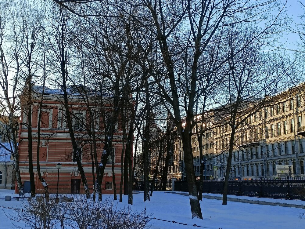 Запланирована экскурсия под названием "Петербург полусумасшедших: от Сенной до Коломны" с фирмой, с которой я уже была три раза на пешеходных - по Васильевском у, Петроградке и на Каменном острове. Сейчас тоже организация очень четкая - никаких лишних звонков и писем - подтверждение и напоминание, а после, что можно оставить отзыв. Однажды я уже была на экскурсии чисто по Коломне. Мы также встречались на Сенной, но дальше абсолютно разные программы. Вначале упор был на маргинальный Петербург. Прошлись улицей, где большое количество публичных домов было (сейчас это тоже выглядит не очень). Впервые услышала про Вяземскую лавру. Так называли район трущоб (как я поняла здание это связано с флигелями дворца Князей Вяземских), где обитал соответствующий контингент - от нищих и рабочих до убийц. Полиция не смела даже вмешиваться в их дела. Единственное решение для восстановления порядка - снести "лавру", что и было сделано ещё до первой мировой. Сейчас на этом месте два здания-близнеца с башенками, которые чуть виднеются с Сенной. Затем наше внимание обращают на самый короткий переулок. Он буквально состоит из двух домов. Конечно, красной нитью двухчасовой экскурсии проходит Федор Михайлович и его герои. Где жил автор, где его герои, как шел Родион с топориком Движемся в хорошем темпе и времени, чтоб сделать пару кадров нет) А столько красивых зданий вокруг. В отличие от Лиговского , Садовая несомненно выигрывает. Далее попадаем в Юсуповский сад. Да, этот район и для богатых и для бедных. Я давно держу на примете этот сад с озером, но так и не добралась до него, а вот тут получилось. Эх, морозно) А вот в этом полосатом здании располагался первый наш Олимпийский комитет, который дореволюционный. Движемся далее по Садовой и очень интересное здание в стиле модерн. О, сколько, ещё Петербург таит в себе красот вот так просто - на улице. Разве может надоесть ездить в него. Это здание изначально строилось для различных городских служб. Я его назвала на флорентийский манер - галерея Уффици. Здесь и обезьянки и маски, летучие мыши и шпили. В парадной - дракончики. А какой интересный двор!!!