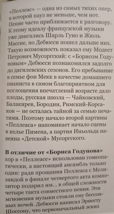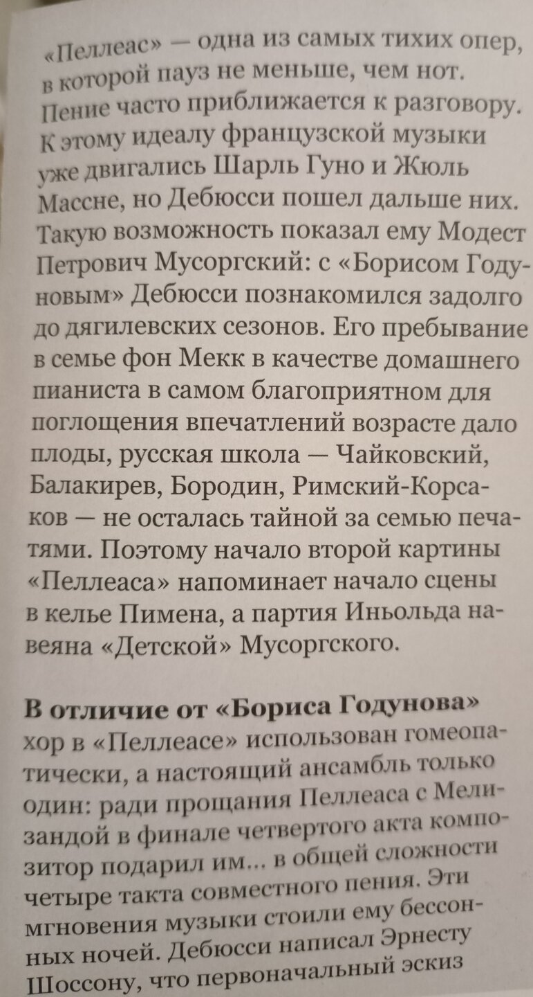 С сайта Мариинского театра: "17 мая 1893 года в парижском театре Буфф состоялся единственный показ недавно написанной пьесы Мориса Метерлинка «Пеллеас и Мелизанда». Постановку организовал почитатель драматурга, известный актер Орельен Люнье-По, исполнивший роль принца Голо. Костюмы, согласно пожеланию автора, сшили в духе Мемлинга, декорации напоминали картины прерафаэлитов, между залом и сценой дрожал прозрачный занавес из тюля. Вариант легенды о Тристане и Изольде разворачивался словно во сне. В зале среди приглашенных зрителей – поэтов Малларме и Анри де Ренье, художников Уистлера и Лёроля – был и 30-летний Клод Дебюсси. Он давно уже искал сюжет для возможной оперы. Еще будучи студентом консерватории, на вопрос своего учителя по композиции Эрнеста Гиро, кто мог бы быть его либреттистом, Дебюсси ответил: «Тот, кто не договаривает до конца. Я бы смог добавить к его мечте свою – вот идеал. Ни конкретной страны, ни эпохи. <…> Нынче в опере слишком много поют. Музыкальные одежды излишне тяжелы. Надо петь только тогда, когда в этом есть необходимость. Полутона. Гризайль. Никаких разработок ради разработок. Длительное развитие не сочетается со словами. Я мечтаю о кратких стихах, подвижных сценах. Плевать мне на три единства! Мне нужны сцены, разнообразные по месту и характеру, где герои не разглагольствуют о своем существовании, участи и прочем». Приведенные ответы настолько провидчески описывают «Пеллеаса», что когда текст процитированной беседы спустя много лет был опубликован, впору оказалось усомниться: а не мистификация ли это? «Пеллеас» – драма, где мало говорят, много молчат, но молчание красноречивее слов, оно словно просится быть заполненным музыкой предчувствий, сомнений, подозрений, прозрений. Дебюсси даже не требовалось создавать либретто. Пьеса Метерлинка, за исключением трех сцен, положена им на музыку слово в слово. Сочинять композитор начал с кульминации – с объяснения героев перед разлукой. С той сцены, где после взрыва чувств и признания Пеллеаса «Я люблю тебя» Мелизанда в полной тишине еле слышно отвечает на одной ноте: «Я тоже». Пребывая в поисках адекватного музыкального языка, композитор жаловался друзьям, что «все это слишком напоминает дуэт г-на такого-то или невесть кого либо же вызывает призрак старого Клингзора». Вагнеровского героя он поминал не случайно. Дебюсси был отравлен вагнеровской драмой и, не находя ничего сопоставимого в современном французском и итальянском оперном театре, ориентировался только на Байройт. «Пеллеас» – это ответ Вагнеру в пространстве похожего сюжета. Там, где Вагнер заставляет своих героев объясняться в течение получаса и говорить всё по многу раз, у Дебюсси – лишь стыдливые реплики, недосказанность, полунамеки. Плотной звучности вагнеровского оркестра Дебюсси предпочитает разреженную пуантилистскую палитру, с частыми divisi струнных, паутиной соло и микстов. Для обособления тембров он даже обдумывал, не рассадить ли оркестровые группы так, чтобы виолончели оказались рядом с фаготами, и не «разлучить ли духовые», чтобы они звучали как ансамбль солистов. Напряженному гармоническому развитию он предпочитает статические последовательности, словно останавливая музыкальное время: метерлинковские пьесы неслучайно называли «драмами ожидания». Дебюсси избегает громогласн