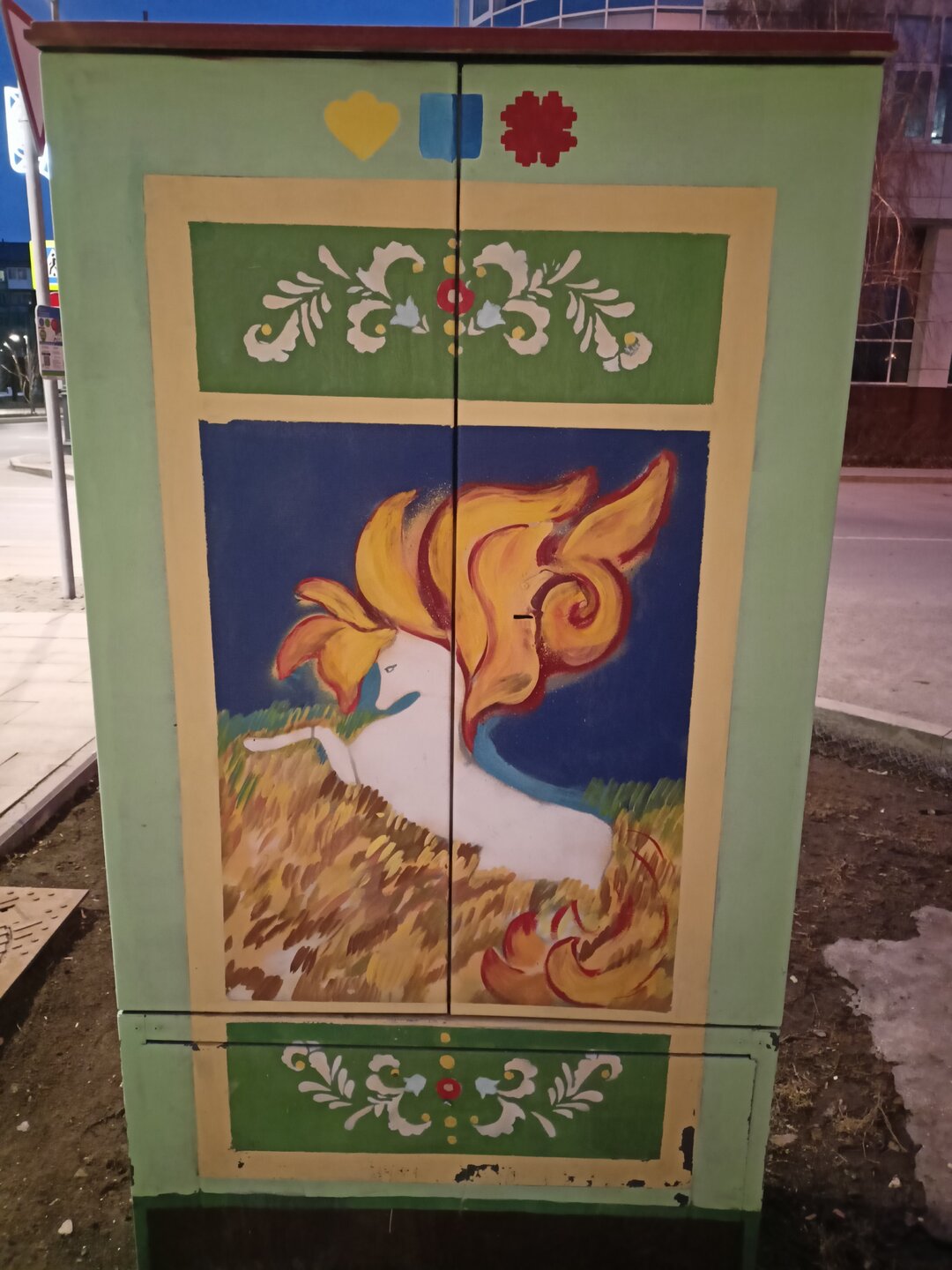 А вот жар-птица на фото у Валерия это отсылка к Коньку-горбунку. Конек в скульптуре есть и у театра кукол (Валерий отказался сделать 10 шагов до него😿😀), а сегодня увидела трансформаторную будку по мотивам. Скорее всего это те лошади, которые потребовал царь у Ивана