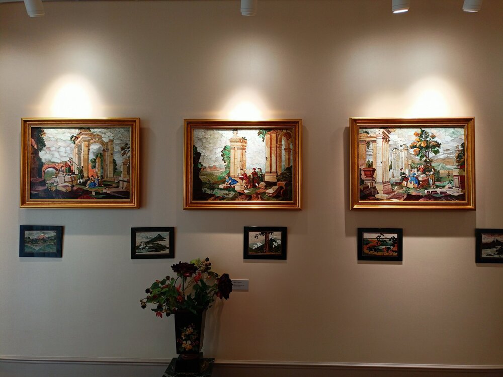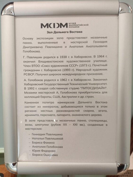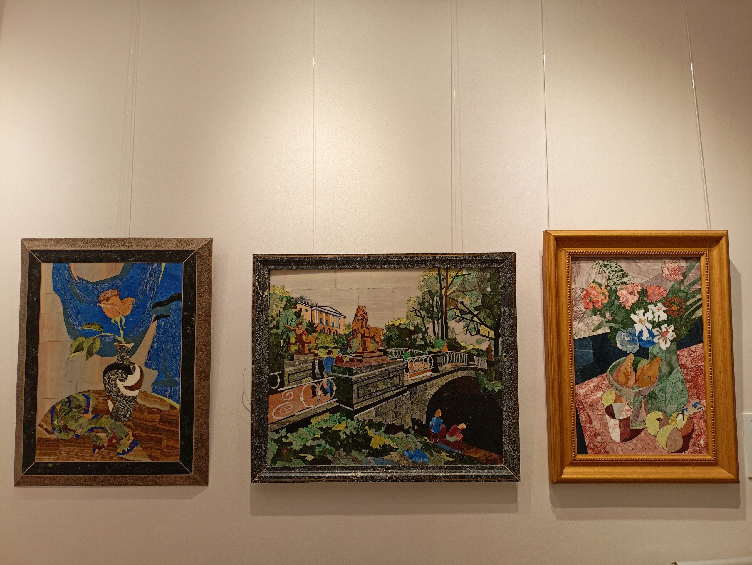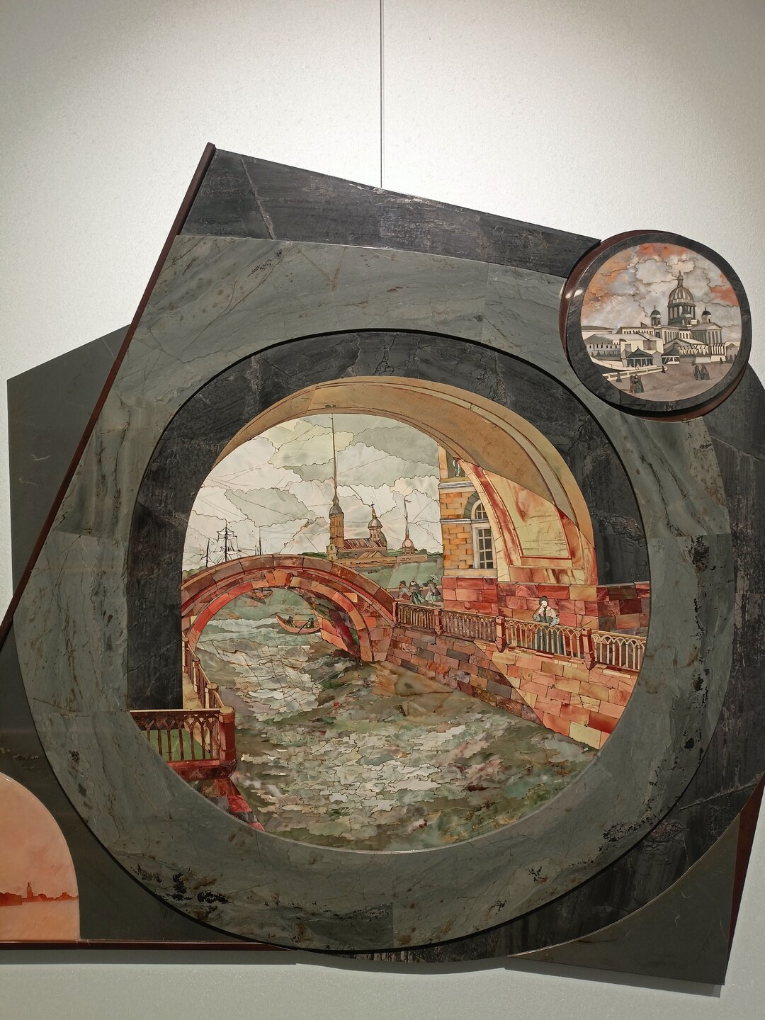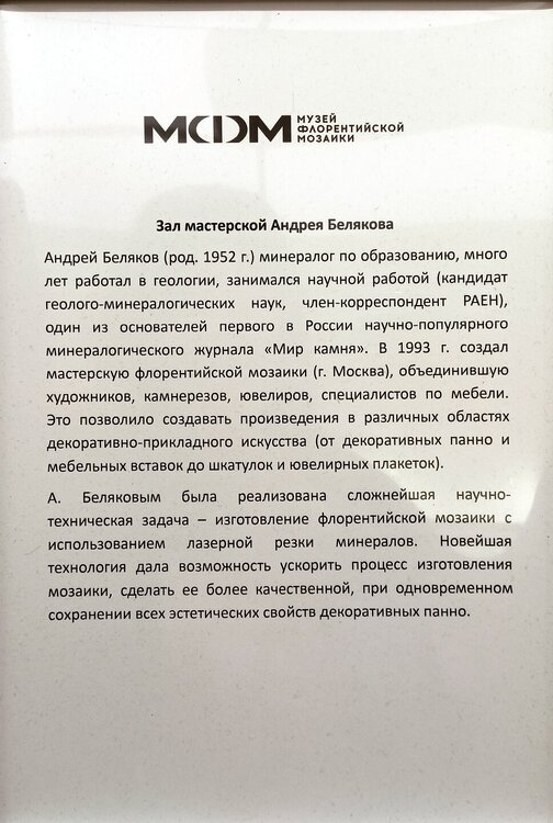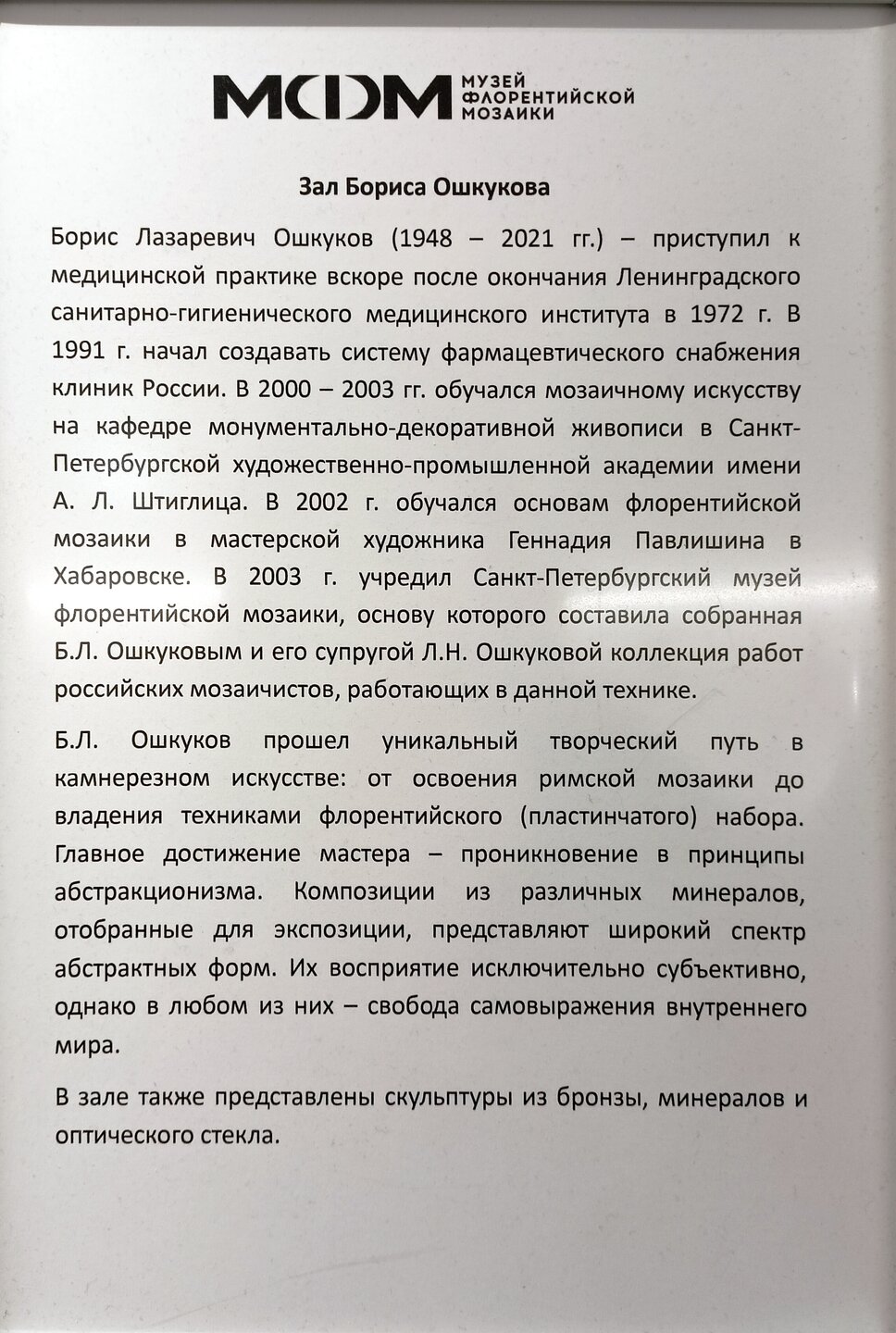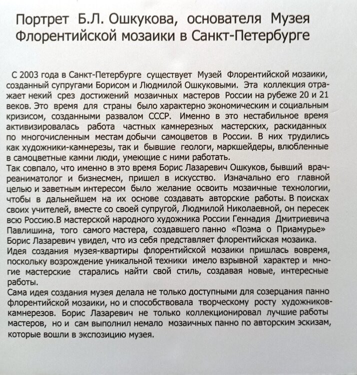 10. Информация на сайте (https://museum.oblfoundation.ru/): "Миссия Деятельность музея направлена на актуализацию мозаичного искусства в контексте современной культуры на стыке традиции и современных интерпретаций. КОЛЛЕКЦИЯ Флорентийская мозаика – вершина камнерезного искусства. Ее истоки восходят к XVI в., когда великий герцог Тосканы, Фердинанд I Медичи, учредил мастерские обработки твердых камней – Opificio delle pietre dure. Заложенные во Флоренции традиции были приумножены в Российской империи и продолжены в наше время. Основатели музея – Борис и Людмила Ошкуковы – собирали коллекцию произведений российских мозаичистов на протяжении десятилетий. Как музейное собрание она впервые была представлена 23 мая 2003 г. Это событие было приурочено к 300-летию основания Санкт-Петербурга. Ныне экспозиция музея включает в себя произведения практически всех мастерских флорентийской мозаики, существующих в современной России. В музее представлено беспрецедентное собрание – более 600 декоративных панно, предметов интерьера, ювелирных украшений." А этот цветок - единственная итальянская работа в музее А по залам мы пройдемся в следующих сообщениях.