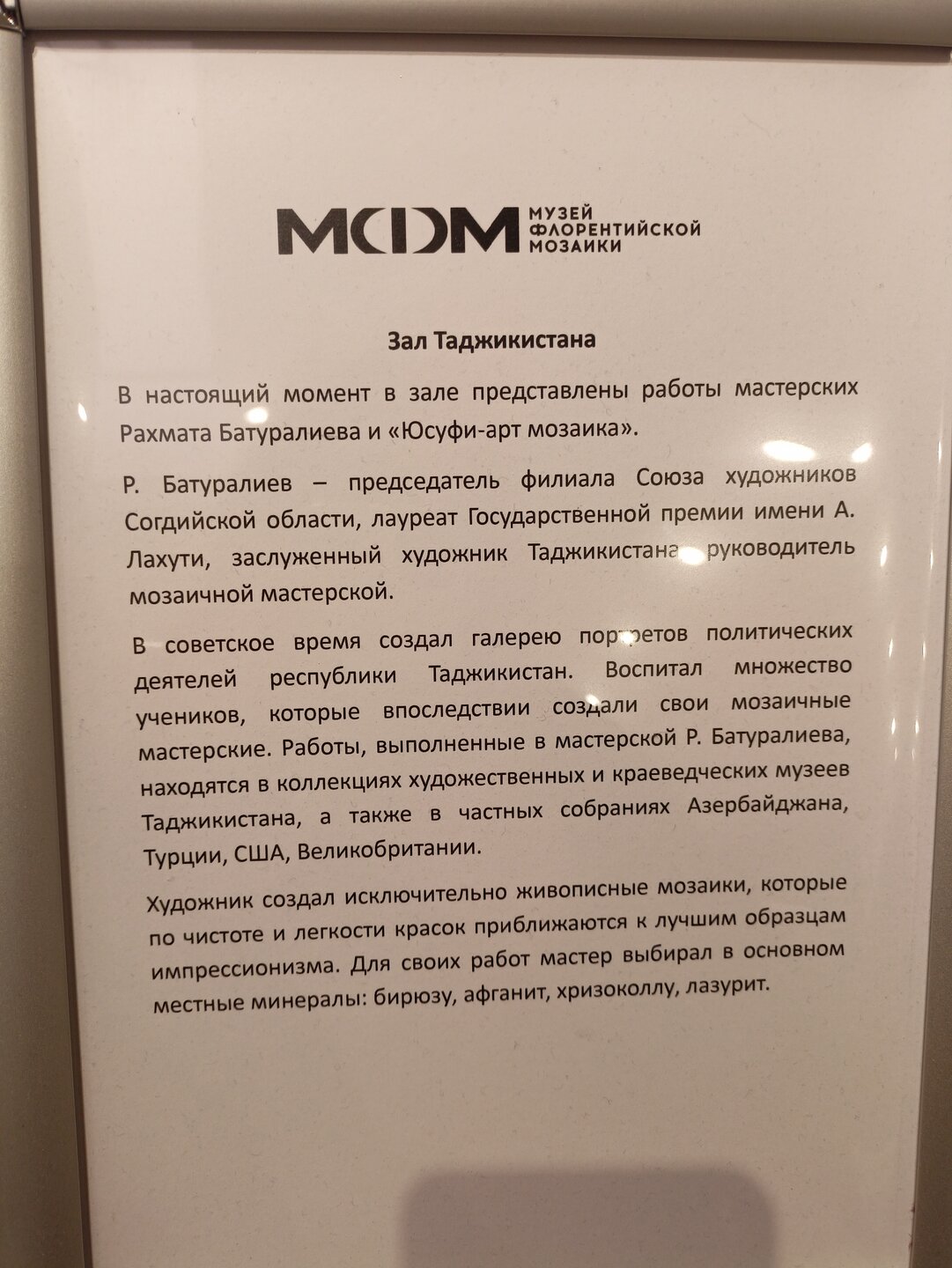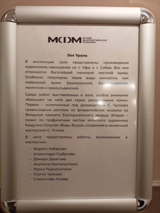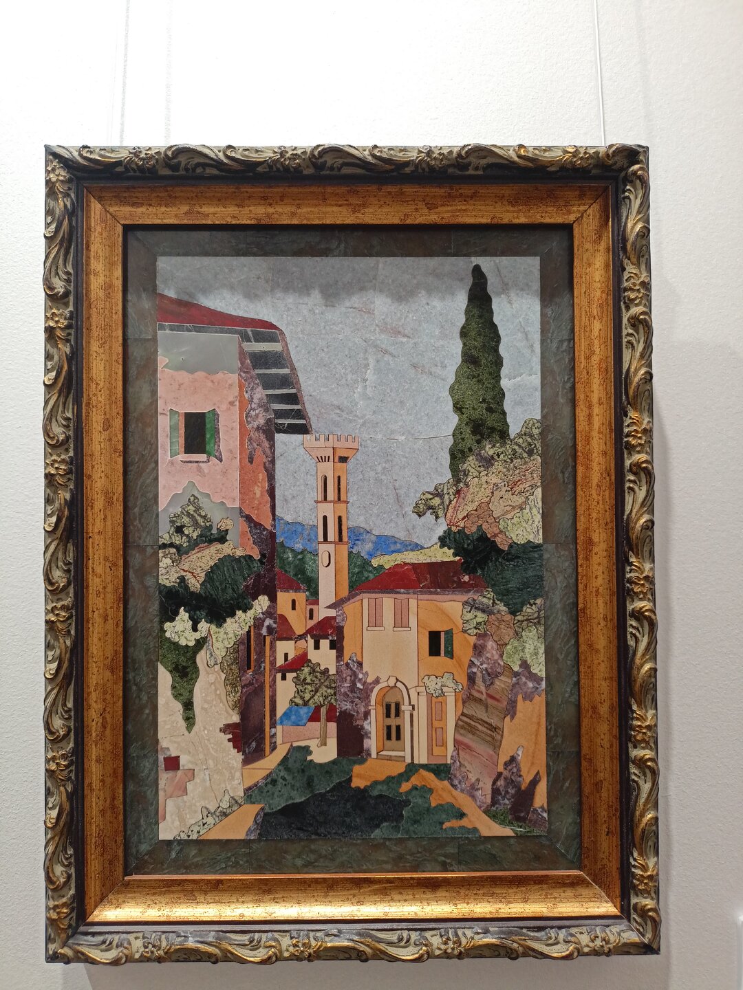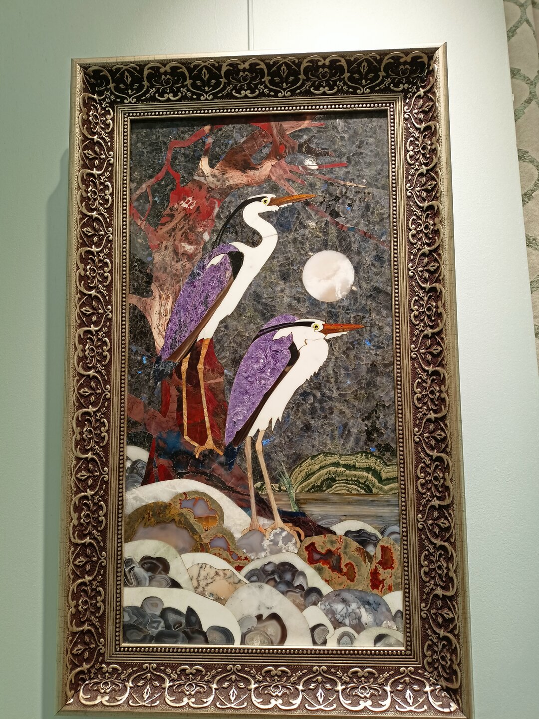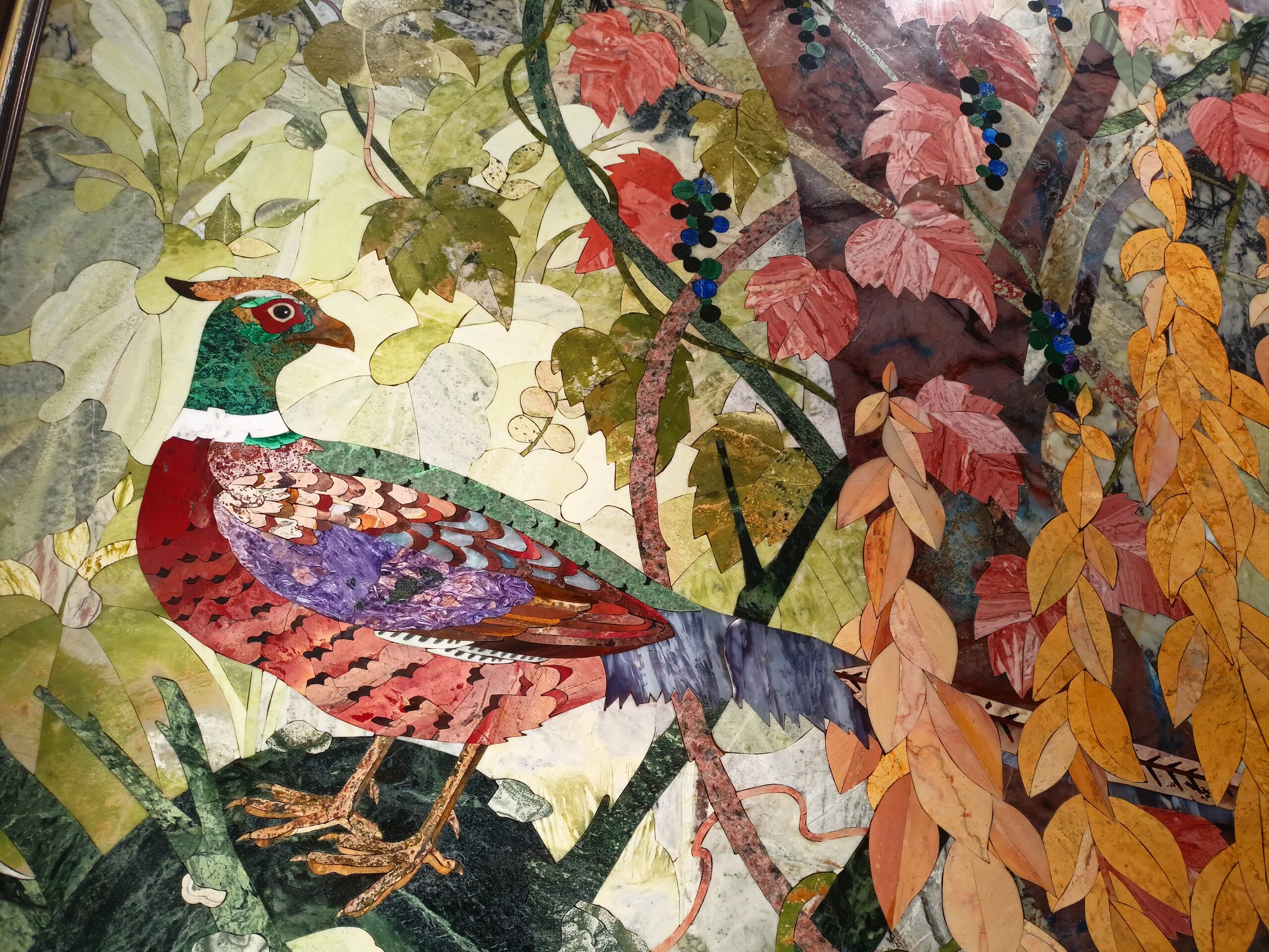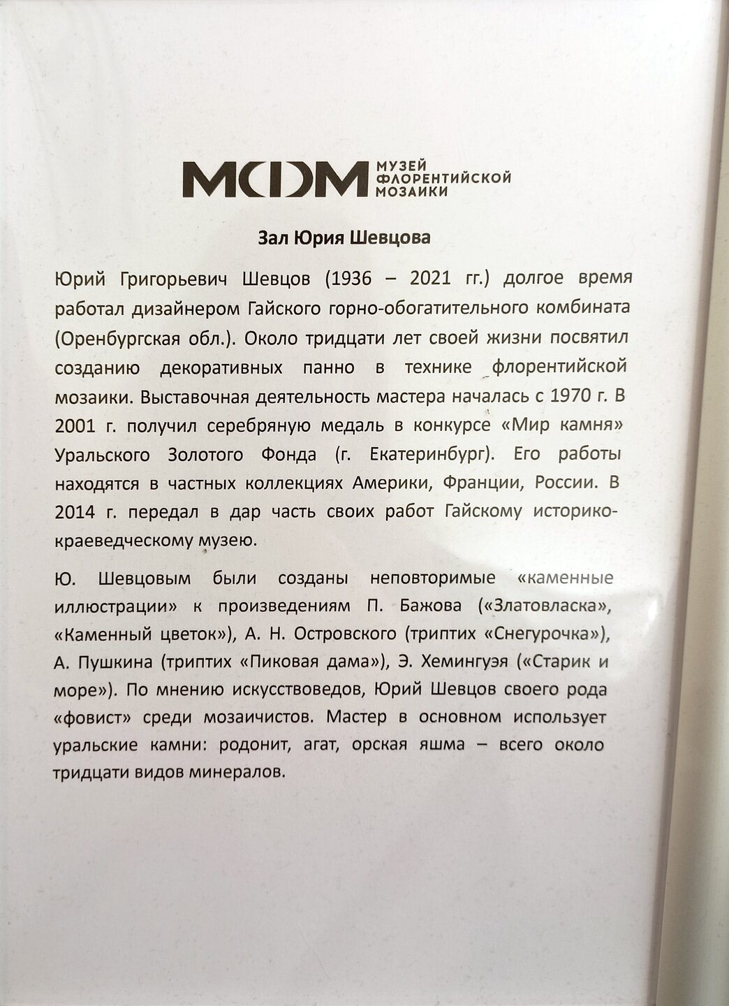 10. Информация на сайте (https://museum.oblfoundation.ru/): "Миссия Деятельность музея направлена на актуализацию мозаичного искусства в контексте современной культуры на стыке традиции и современных интерпретаций. КОЛЛЕКЦИЯ Флорентийская мозаика – вершина камнерезного искусства. Ее истоки восходят к XVI в., когда великий герцог Тосканы, Фердинанд I Медичи, учредил мастерские обработки твердых камней – Opificio delle pietre dure. Заложенные во Флоренции традиции были приумножены в Российской империи и продолжены в наше время. Основатели музея – Борис и Людмила Ошкуковы – собирали коллекцию произведений российских мозаичистов на протяжении десятилетий. Как музейное собрание она впервые была представлена 23 мая 2003 г. Это событие было приурочено к 300-летию основания Санкт-Петербурга. Ныне экспозиция музея включает в себя произведения практически всех мастерских флорентийской мозаики, существующих в современной России. В музее представлено беспрецедентное собрание – более 600 декоративных панно, предметов интерьера, ювелирных украшений." А этот цветок - единственная итальянская работа в музее А по залам мы пройдемся в следующих сообщениях.