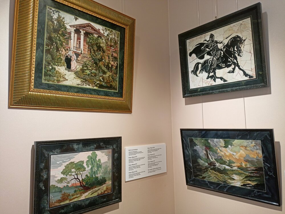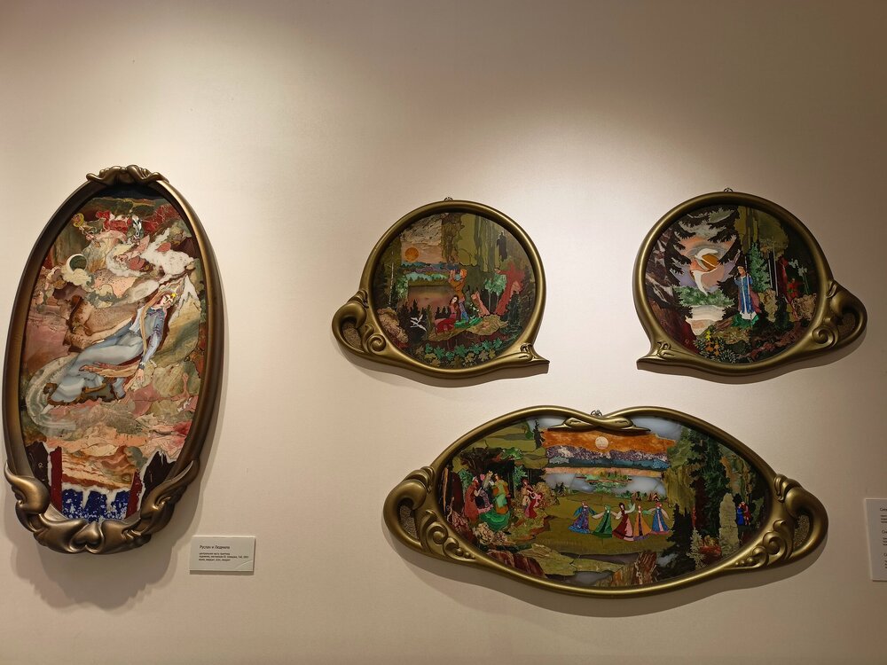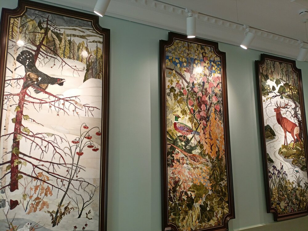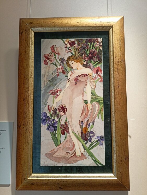 7. В зале Урала больше всего понравились каменные панно, которые в янтарной комнате сделаны из янтаря. В музее я ходила без экскурсии. О ней надо было предварительно договориться и стояла она немногим дороже основного билета (500 р). Но смотрительницы мне в общих чертах рассказала и показала залы. Ещё издалека я узнала стилистику Альфонсо Мухи. И действительно , панно по мотивам его картины. Как и несколько других работ в этом зале
